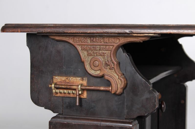 Um die Tischplatte in der Neigung zu verstellen, wird eine an der linken Seite befindliche Arretierung gelöst. Nun kann die Platte in die gewünschte Position gebracht werden. Das gusseiserne System, das diese Verstellbarkeit ermöglicht, ist mit DEPOSE PARIS BERNE BREVETE S.C.D.G. PATENT beschriftet.
