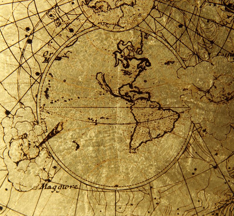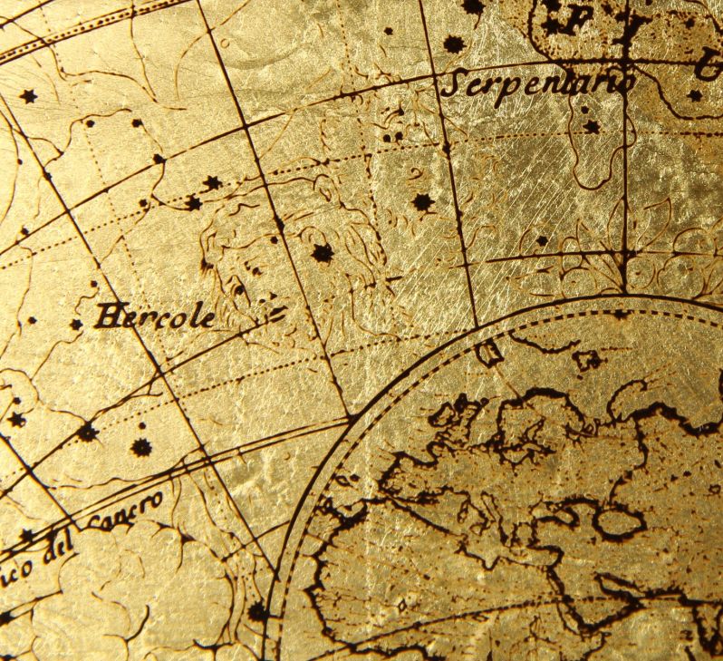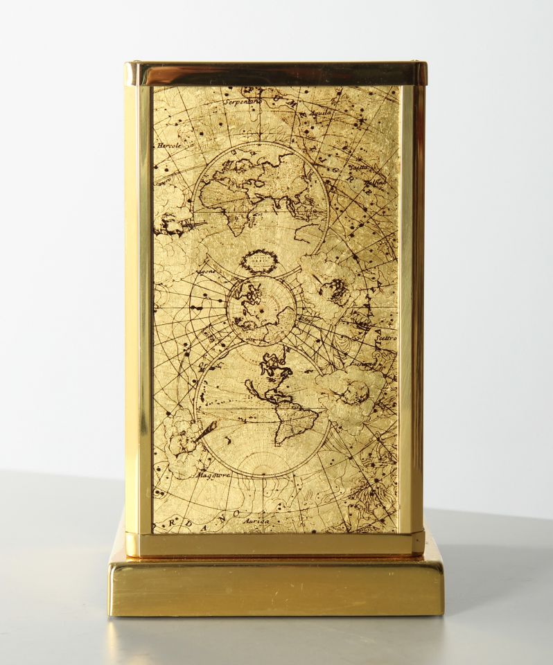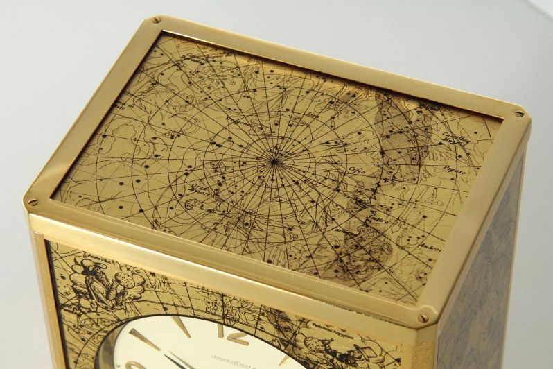 Längen- und Breitengrade ziehen sich über alle Ansichtsflächen der Uhr. Auf den zwei Seiten befinden sich alte Weltkarten. In den Ecken der frontseitigen Tür sehen wir Forscher beim Studieren und Vermessen des Himmelsglobus.