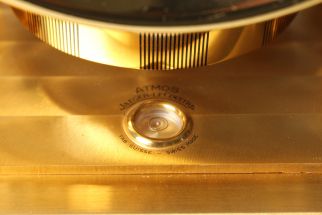 Atmos II im matt gebürstet vergoldeten Gehäuse mit polierten Ständern. Gebläute Schrauben, Rückseitige Regulierschraube, Drehpendel mit in 8 Segmenten eingeteilten feinen senkrechten Streifen.