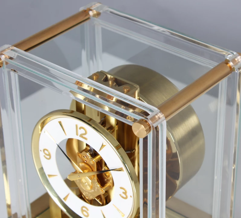 Atmos Kaliber 526 im Glas/Plexiglasgehäuse mit vergoldetem Sockel und Querstreben.