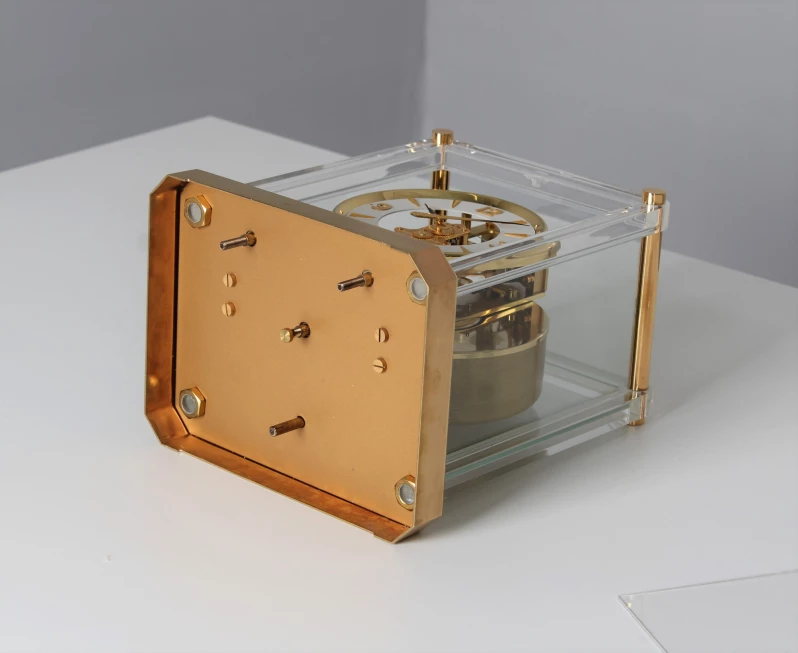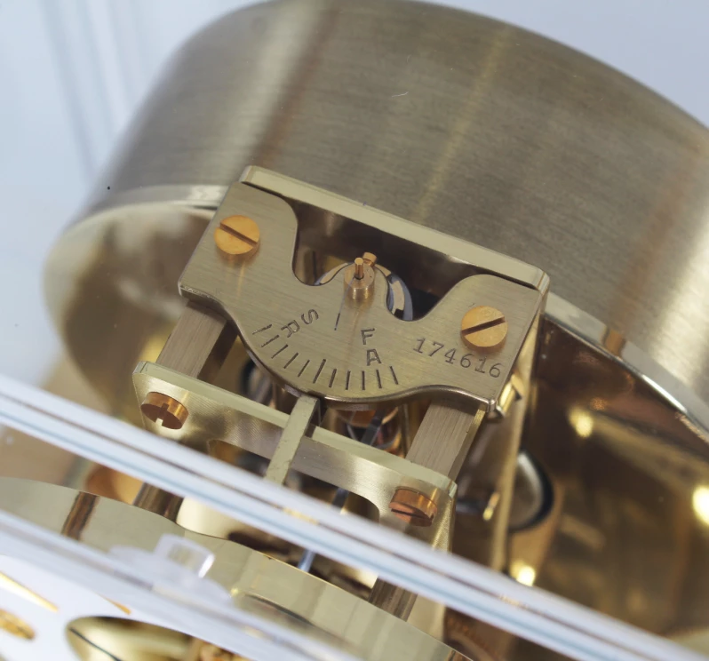 Eine Temperaturdifferenz von nur einem Grad Celsius zieht die Uhr für 48 Stunden auf. Dieser interessante Aufzugmechanismus findet seine Ergänzung in einem vorzüglichen Uhrwerk äußerster Präzision mit einem schweren Torsionspendel (Drehpendel).
