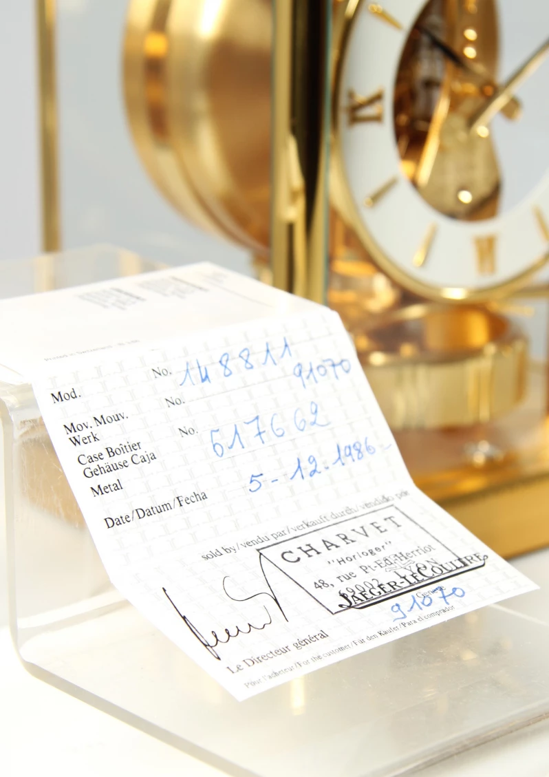 Im Lieferumfang enthalten sind die originalen Begleitpapiere der Uhr wie Bedienungsanleitung und Prüfbescheinigung. Allesamt gestempelt von Charvet in Lyon, dem Uhrmacher, der die Uhr werksneu am 05.12.1986 verkauft hat. Außerdem vorhanden und im Lieferumfang enthalten ist die Transportbox von Jaeger LeCoultre, diese allerdings mit deutlichen Gebrauchsspuren.