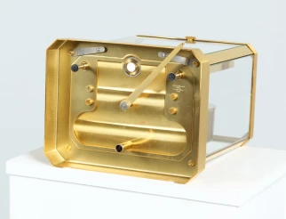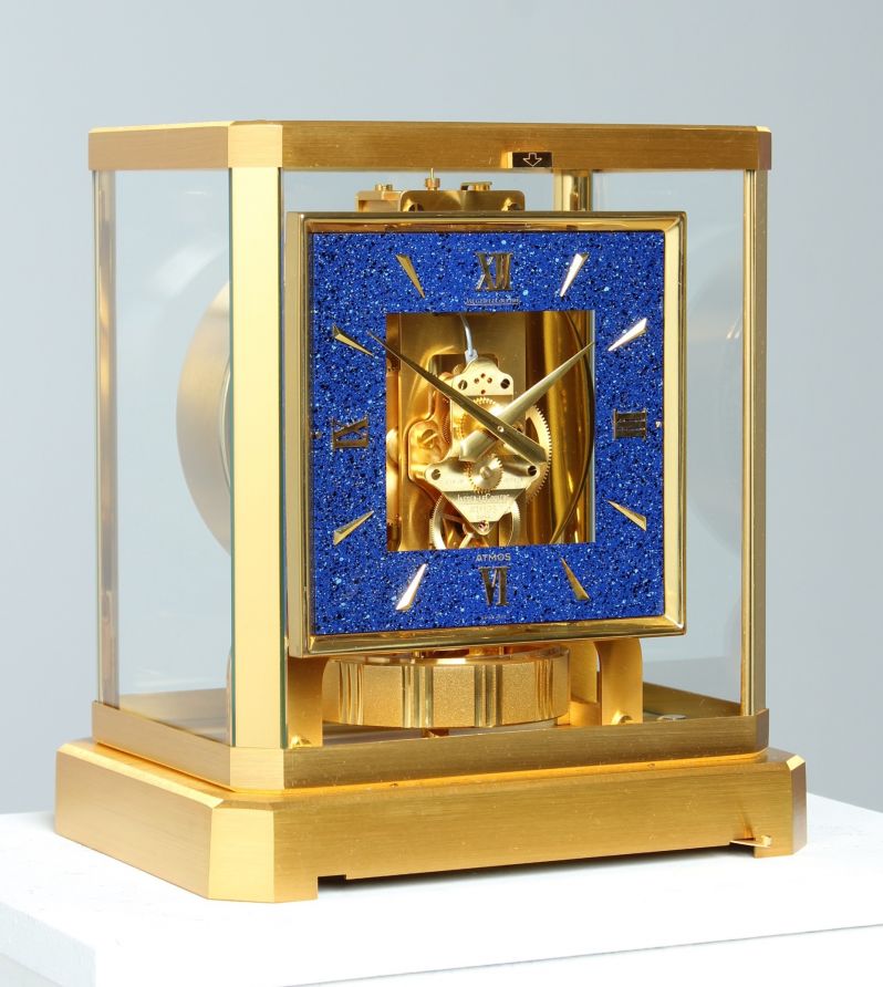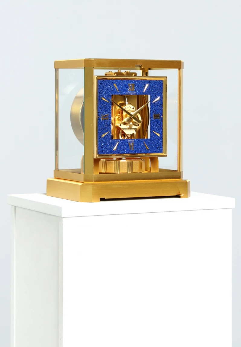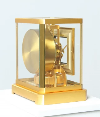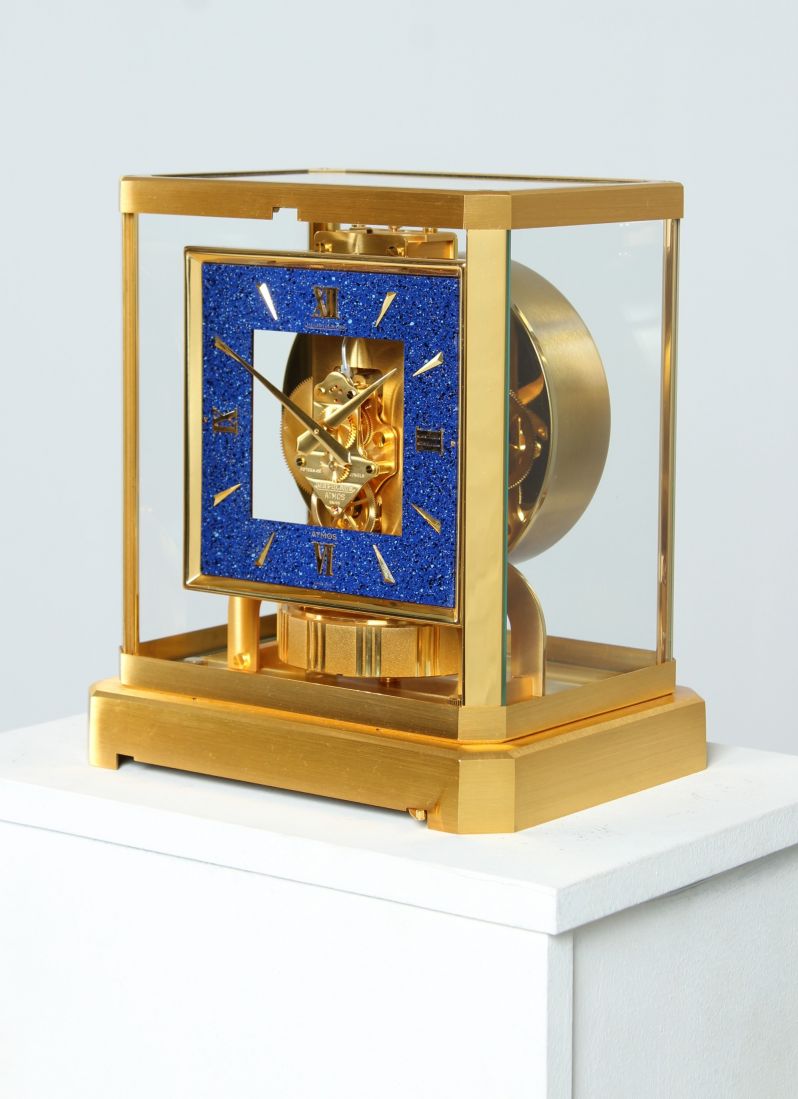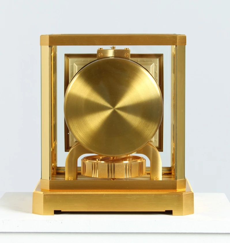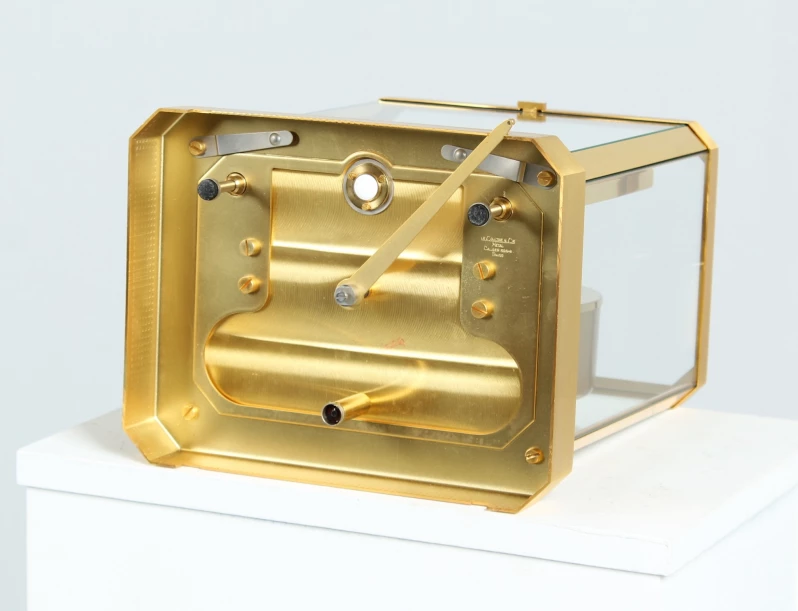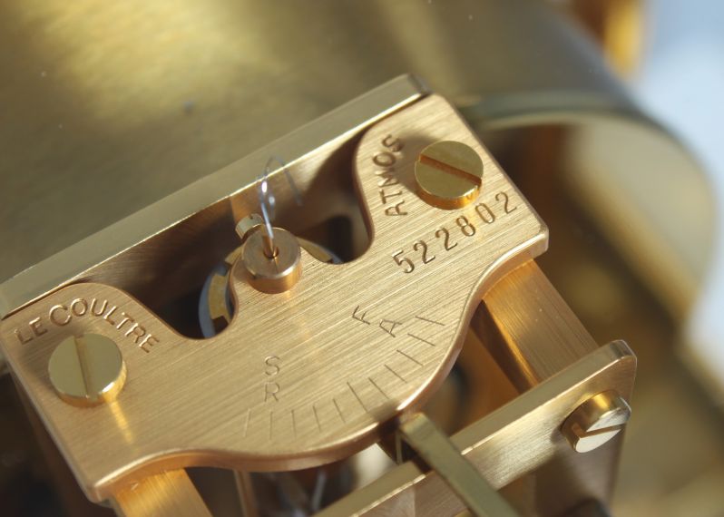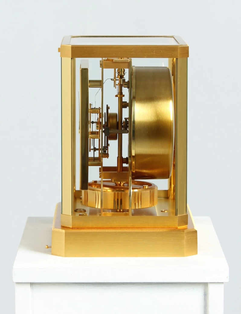 Atmos VIII im matt gebürstet vergoldeten Gehäuse mit polierten Ständern. Drehpendel mit senkrechten eingefrästen Streifen. Frontscheibe mit Druckknopf komplett herausnehmbar.