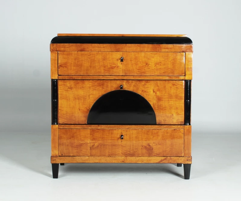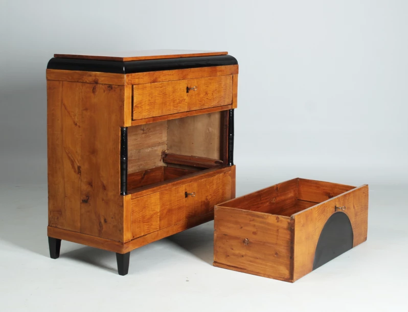 Auf ebonisierten Spitzbeinen stehendes dreischübiges Möbelstück. Die Schubladenfronten sind in geflammter Birke furniert, die Korpusteile sind aus massivem Birkenholz.