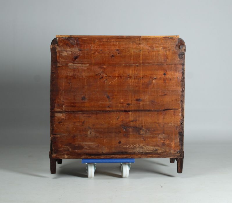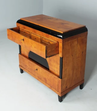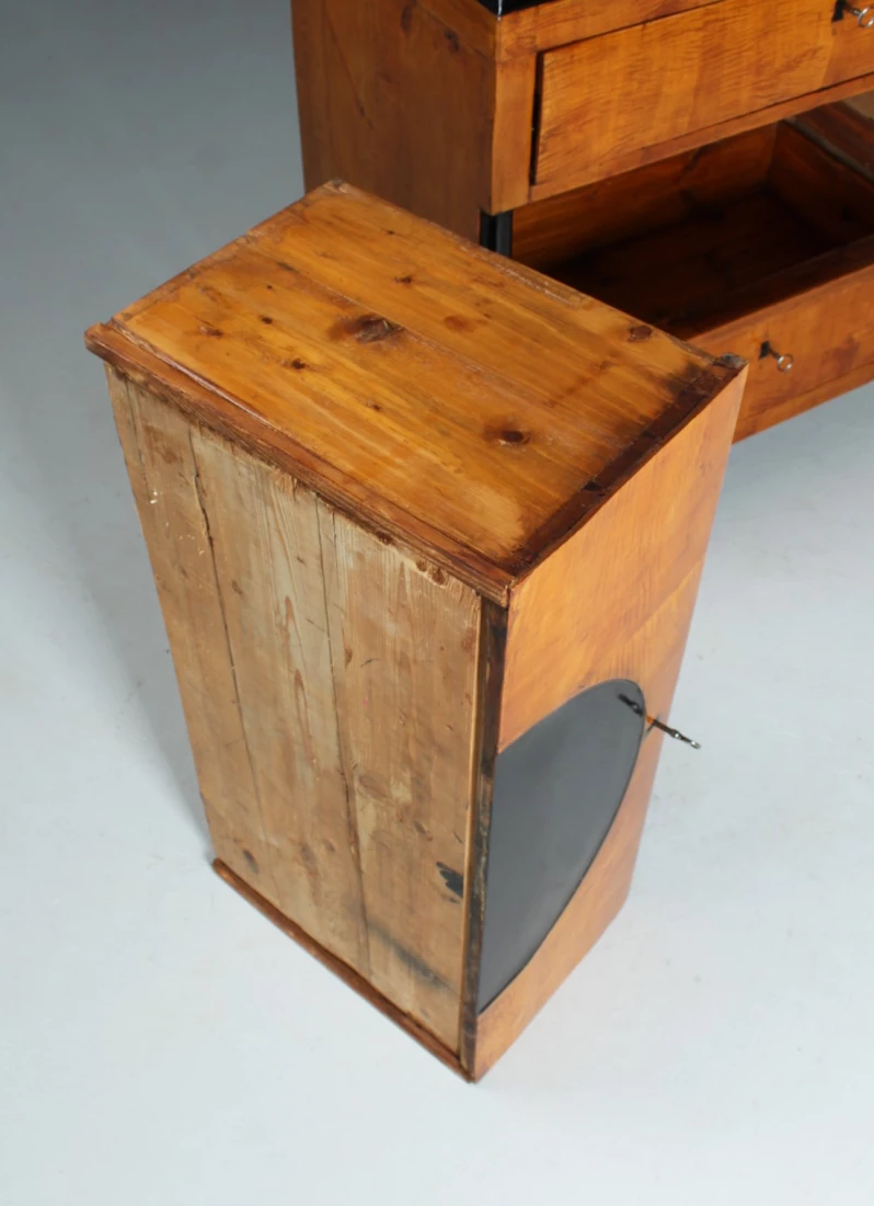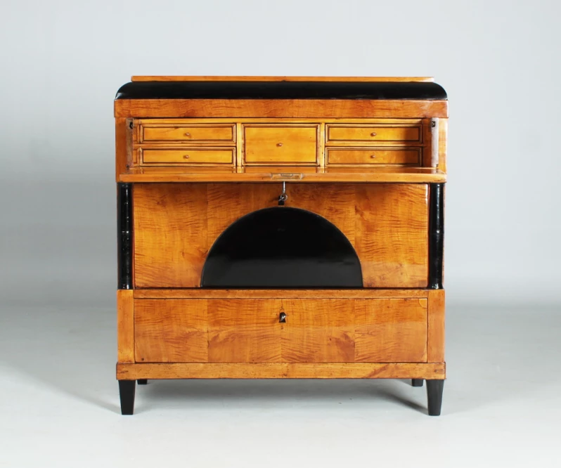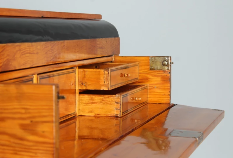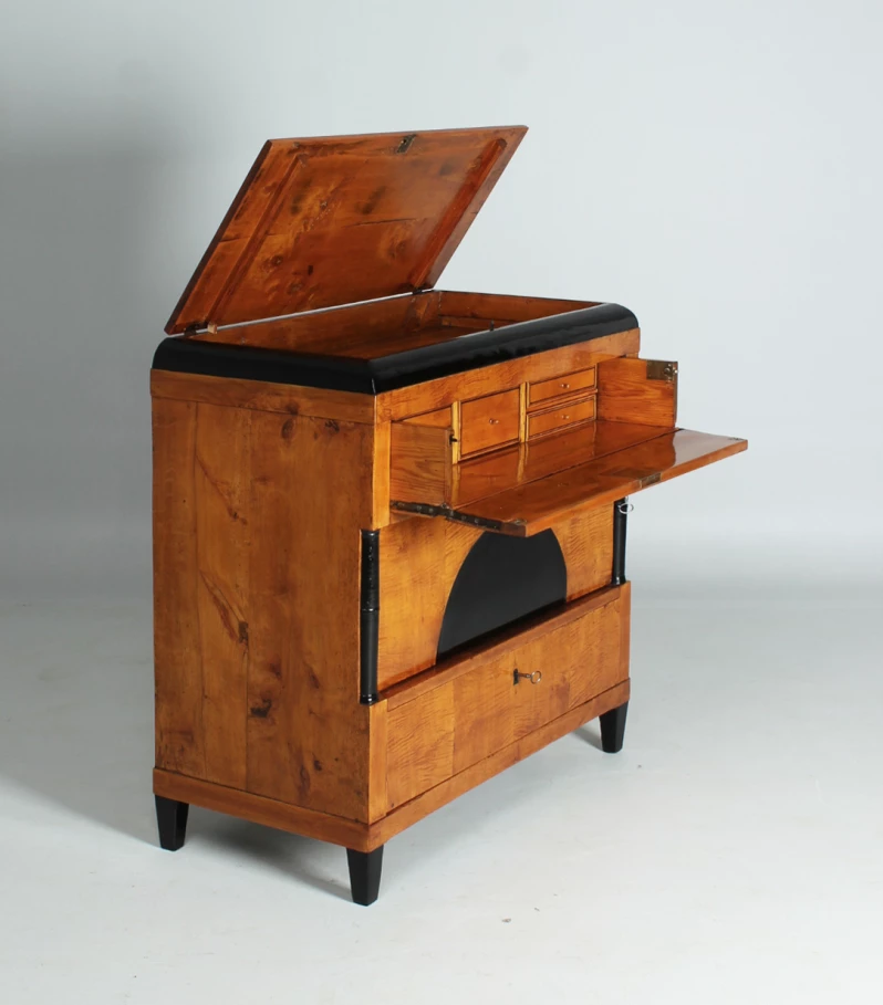 Die obere Schublade verbirgt ein kleines Sekretärfach mit fünf kleinen Schublädchen. Durch Abklappen der Front entsteht eine waagerechte Fläche, die als Schreibfläche nutzbar ist.