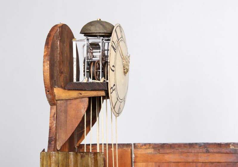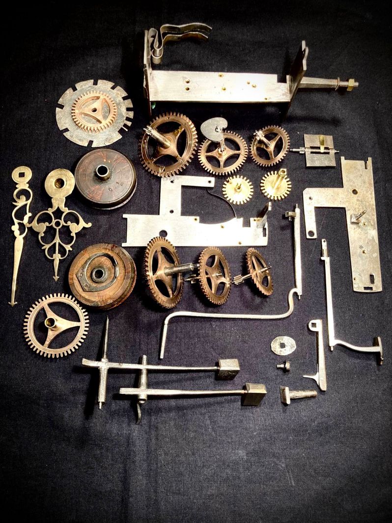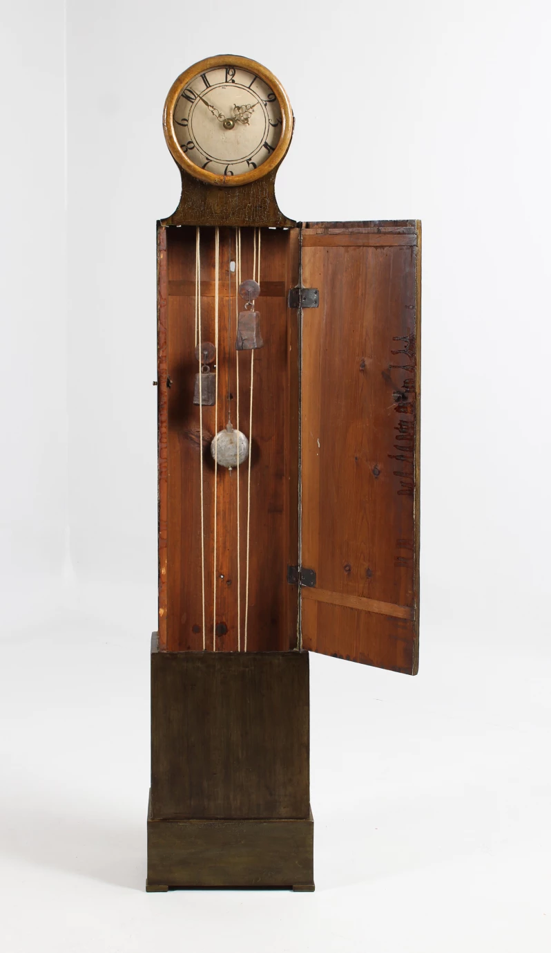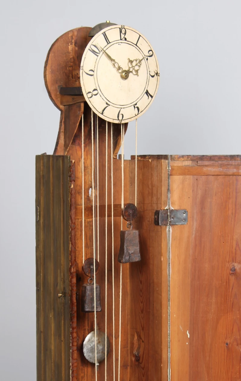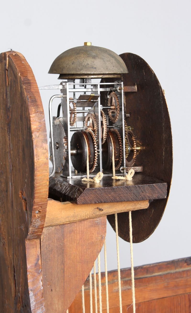 Das Gehäuse wurde sanft gereinigt. Die Altersspuren und das Craquelé in der Farbfassung wurden dabei bewusst erhalten. Das Werk wurde zerlegt und generalüberholt. Es läuft und schlägt zuverlässig.