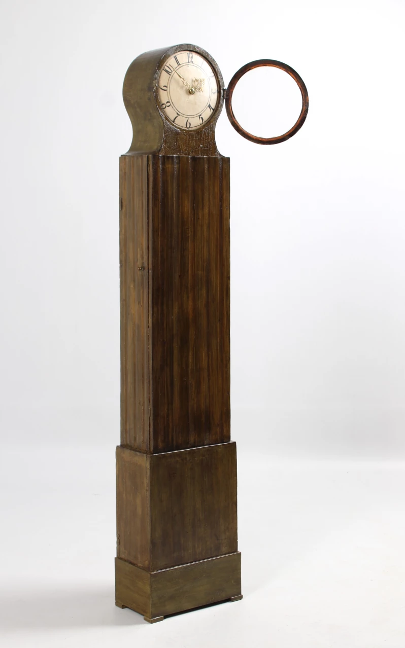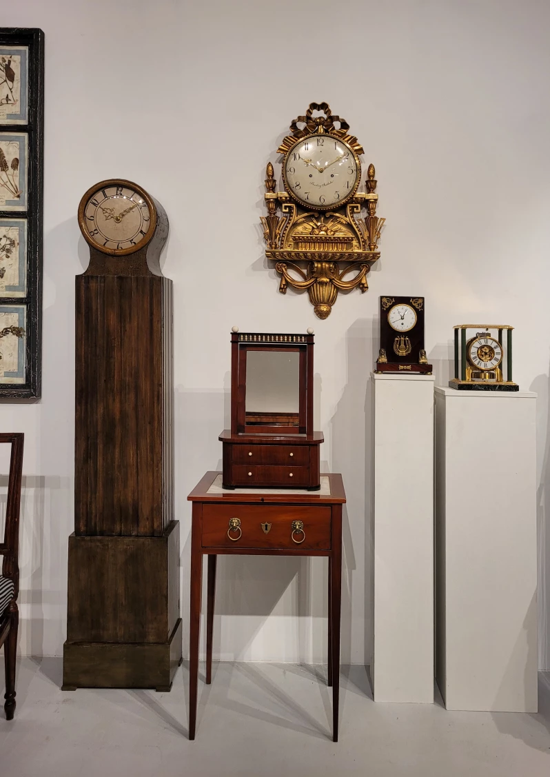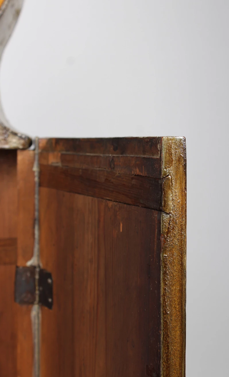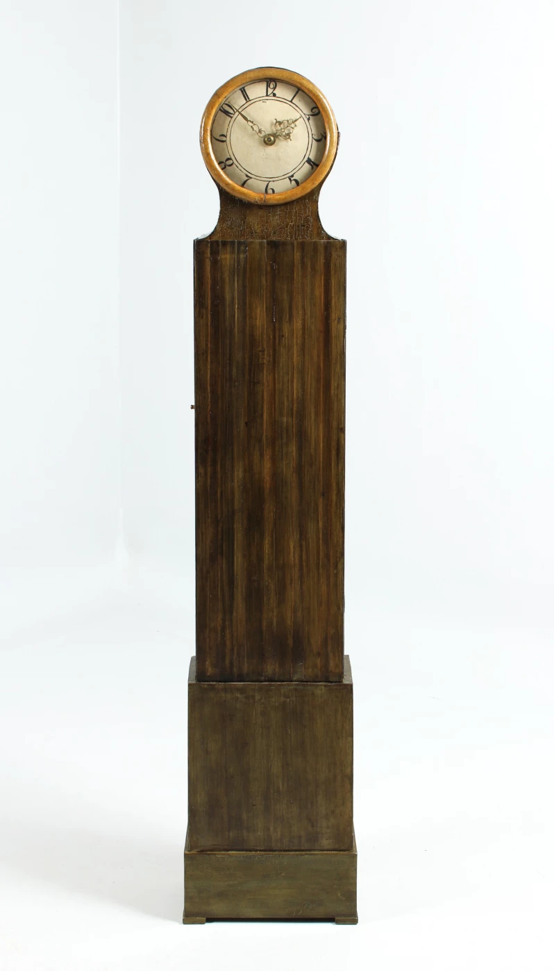 Das Gehäuse wurde sanft gereinigt. Die Altersspuren und das Craquelé in der Farbfassung wurden dabei bewusst erhalten. Das Werk wurde zerlegt und generalüberholt. Es läuft und schlägt zuverlässig.