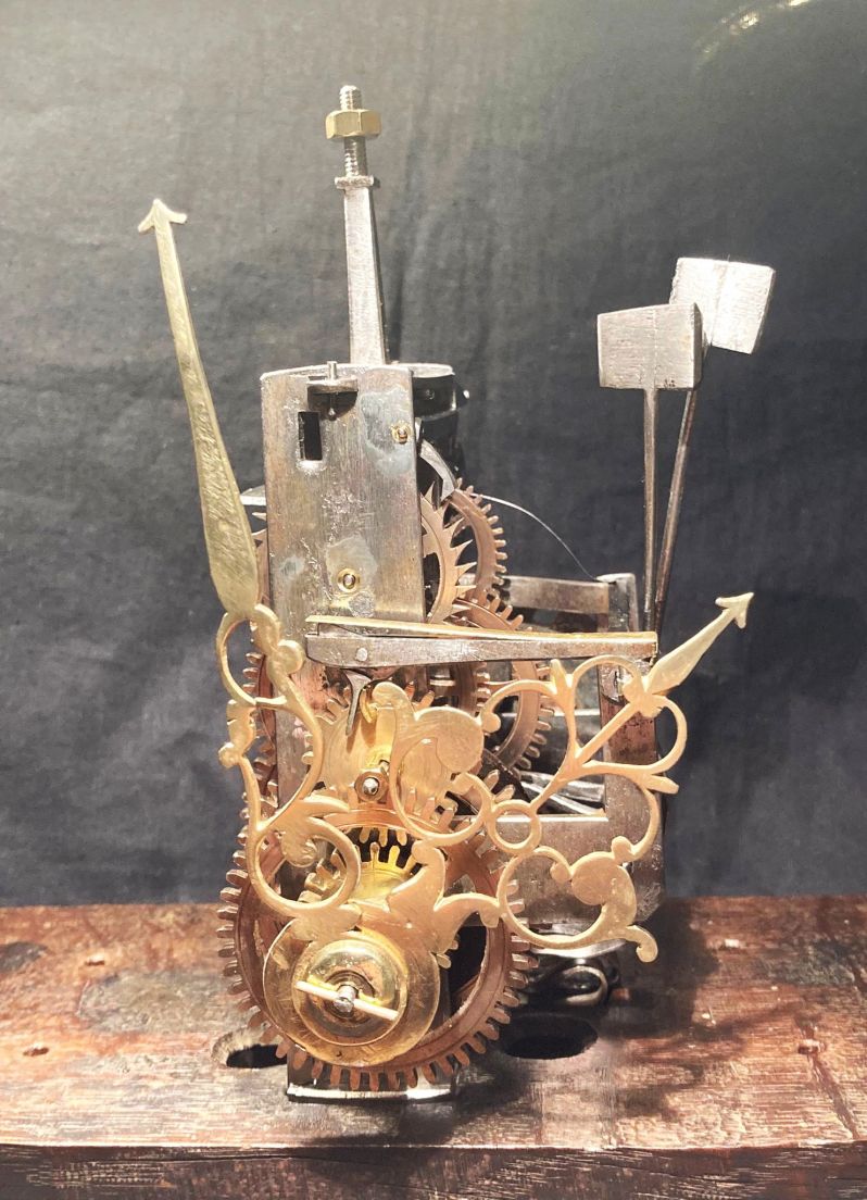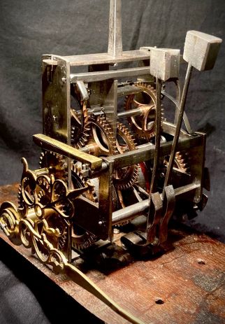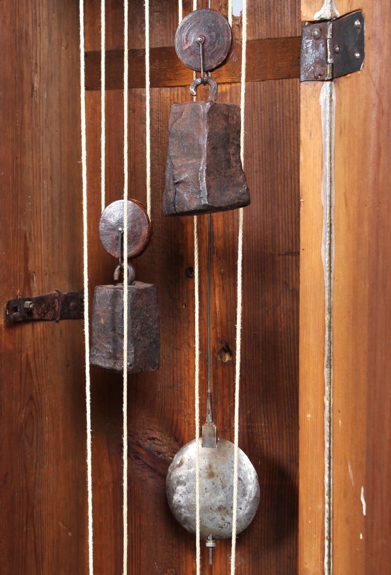 Sauber ausgeführtes Uhrwerk mit circa 30 Stunden Gang. Gehwerk und Schlagwerk sind mittels drei Eisenplatinen hintereinander angeordnet. Schlagauslösung durch Storchenschnabel und Schlossscheibe. Flaschenzug Gewichtsantrieb mit Holz-Umlenkrollen auch im Werk.