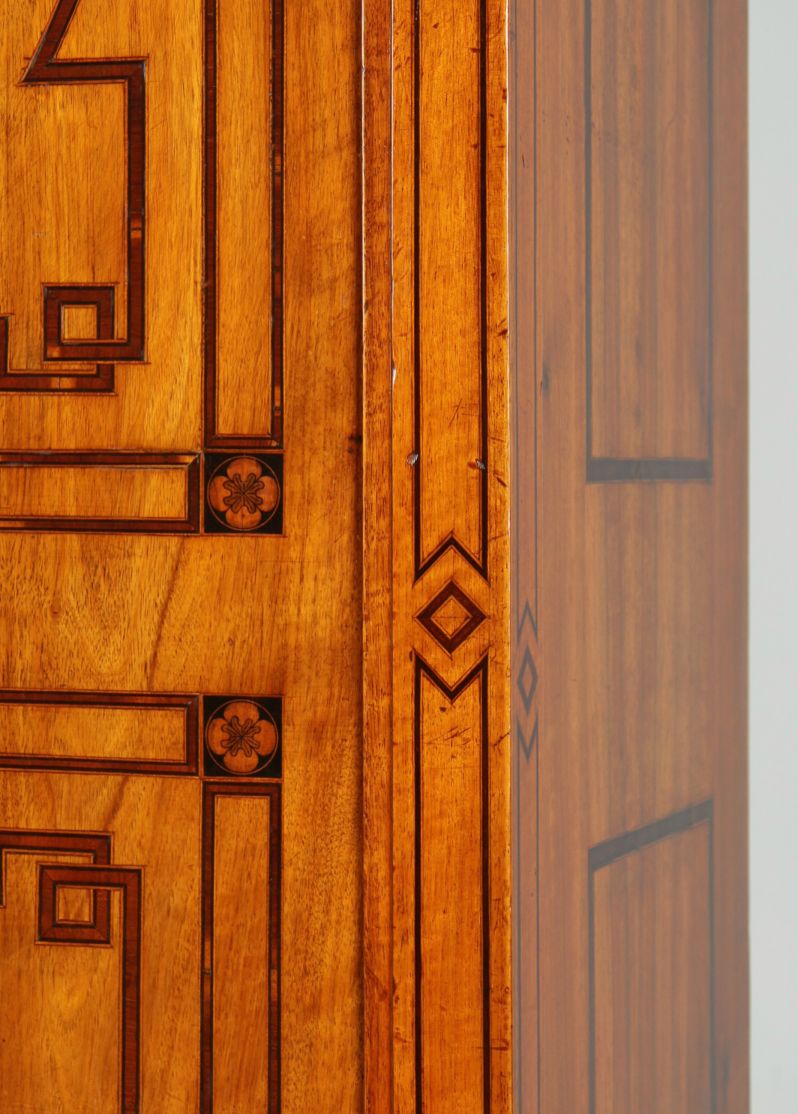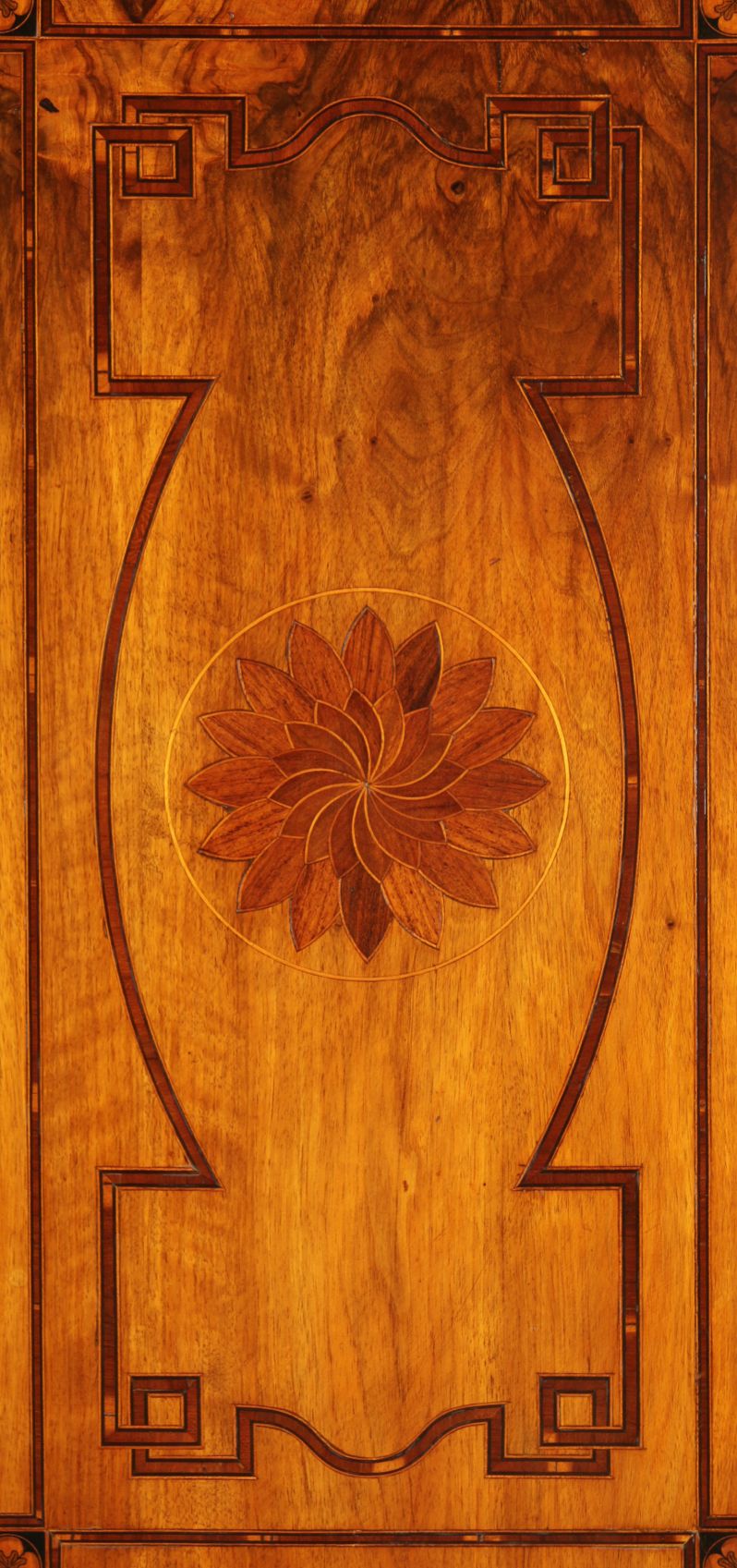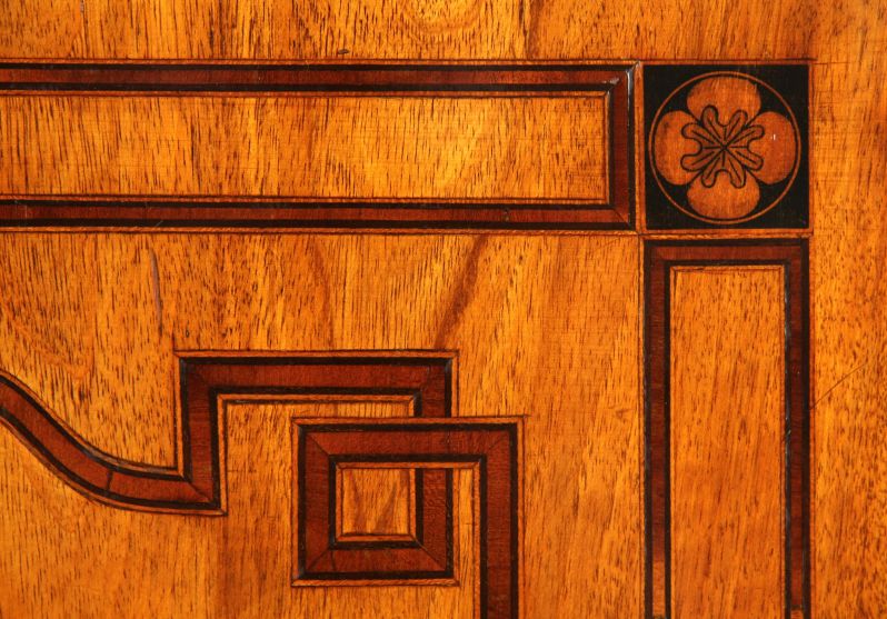 Unterbrochen wird der Maserungsverlauf von geometrischen Marketerien, auf der Front in besonders eindrucksvoller Weise. Wir sehen vier von Eckrosetten und geradlinigen Bandeinlagen begrenzte Rechteckfelder, in deren Zentren je eine große, von in sich gewundenen Bändern gerahmte Blüte im Rundmedaillon zu sehen ist.