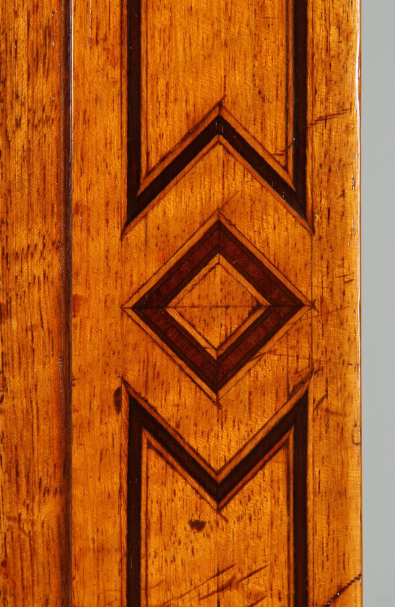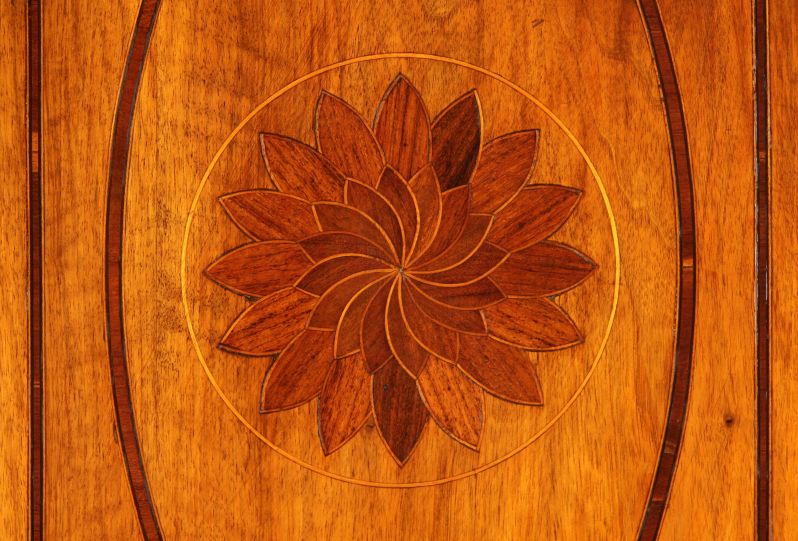Schauen Sie sich bitte die Deatilfotos der Einlegearbeiten an. Sie werden feststellen, dass die Bandeinlagen aus bis zu fünf verschiedenen Lagen bestehen. Wir sehen hauchdünne Fäden aus Mahagoni, Zwetschge, Ebenholz und Ahorn. Auch die einzelnen Blätter der zentralen Blüten werden durch feine Ahornfäden konturiert.