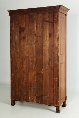 Auf gesockelten Vierkantfüßen stehendes, zweitüriges Möbelstück. Die in der Verängerung der vorderen Füße aufbauenden Lisenen sind als Pfeiler ausgearbeitet mit eckigen Basen und Kapitellen; sie tragen optisch das Gebälk mit dem auskragenden Gesims.