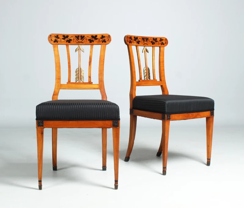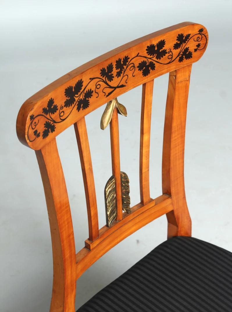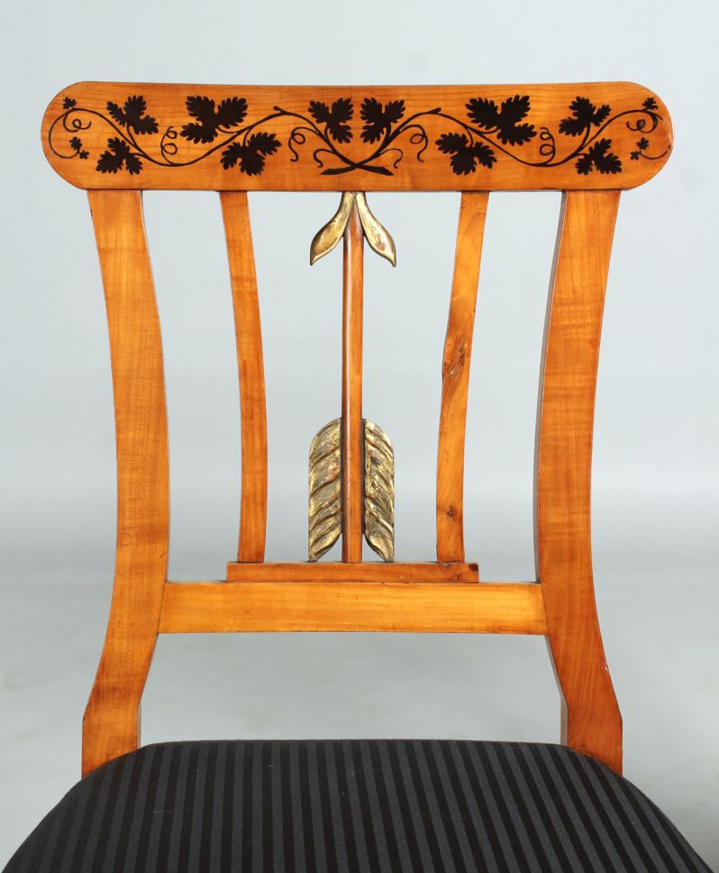 Die hinteren Beine sind leicht ausgestellt und gehen über in die leicht konkav eingezogene Rückenlehne. Ein geschnitzter und vergoldeter Pfeil ist das zentrale Gestaltungselement der Rückenversprossung. Das Rückenbrett ist mit floralen Einlegearbeiten aus Ebenholz verziert.