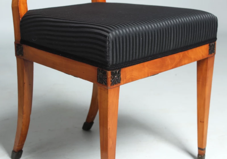 Auf Spitzbeinen und in Messingsabots stehende Stühle mit gerader Zarge.