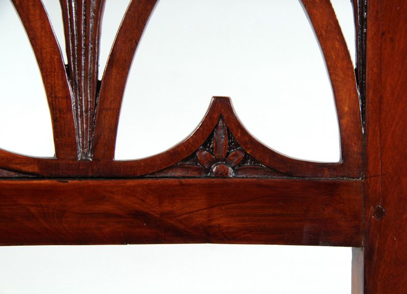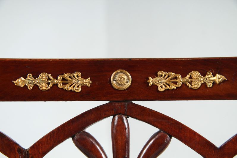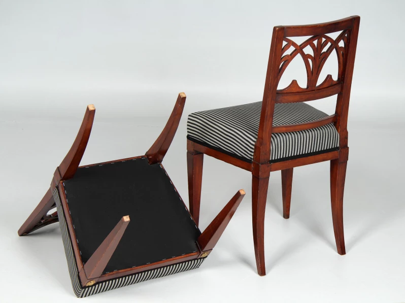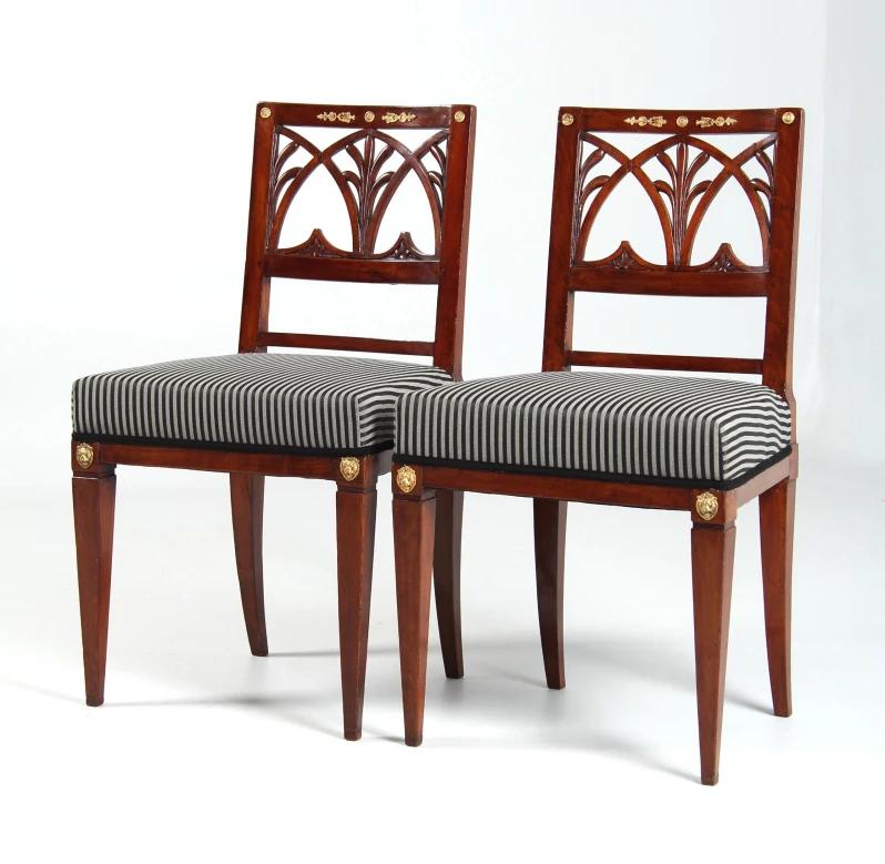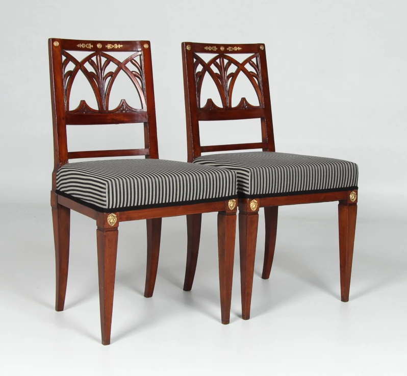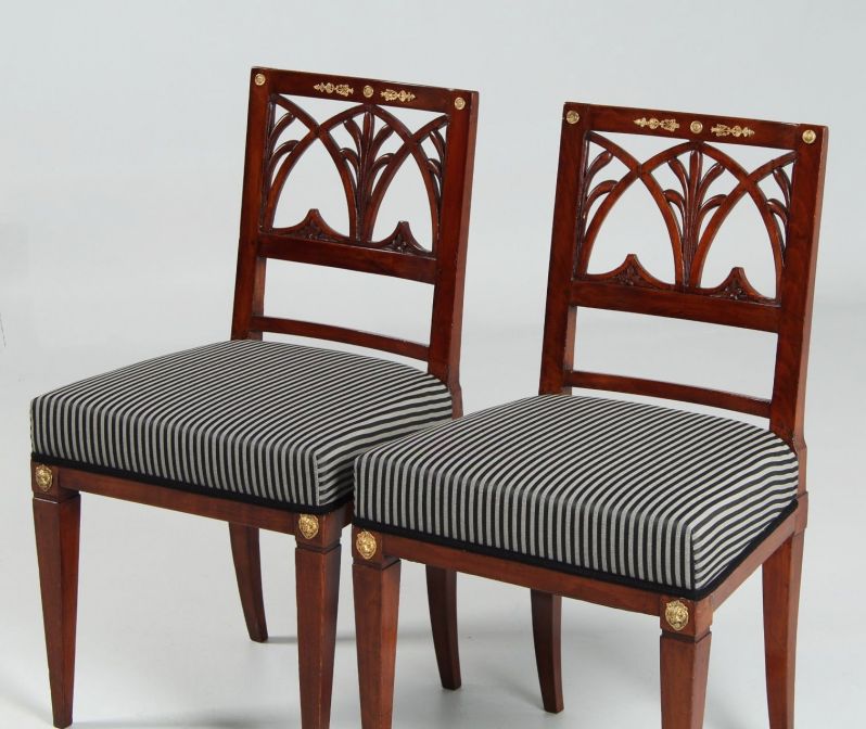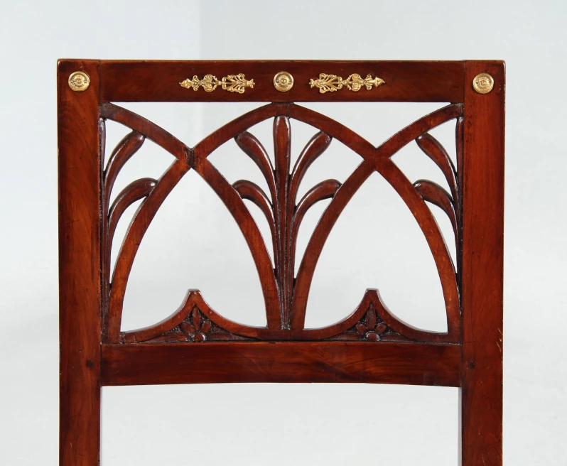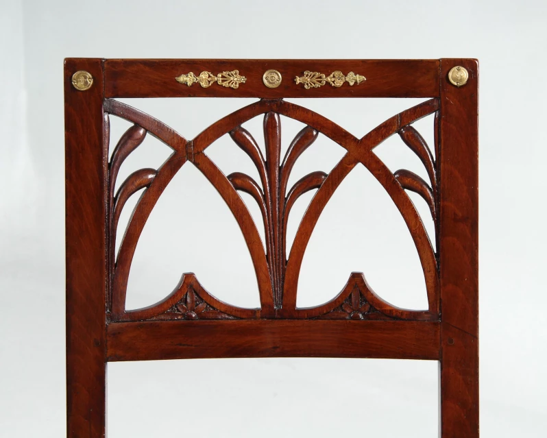 Das Hauptaugenmerk gilt der aufwendig gestalteten Rückenlehne mit Durchbrucharbeiten in Form von Spitzbögen und Schilfblättern. Das Beschlagwerk am Rückenbrett besteht aus einem zentralen Medaillon, von dem stilisierte Palmetten mit Fackelabschluss ausgehen, sowie zwei auf den Ecken angebrachten Plaketten, die bei einem der beiden Stühle ergänzt wurden.