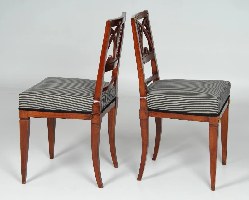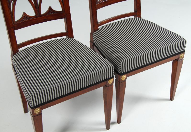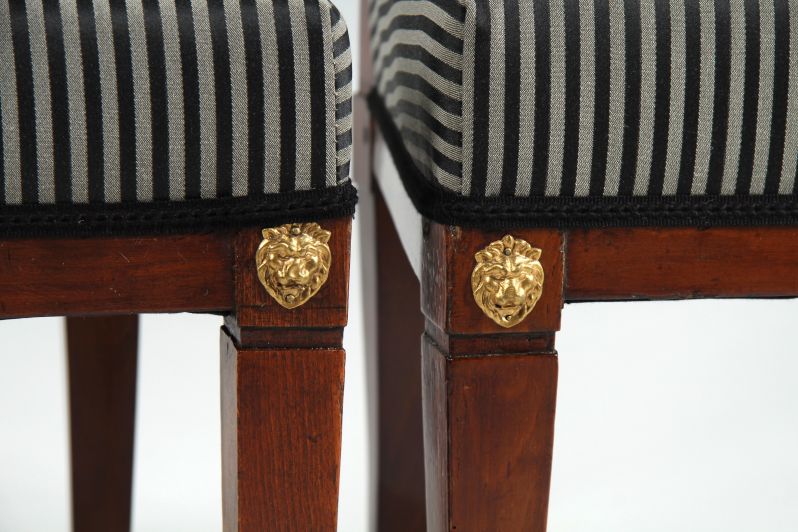 Seltenes Paar klassizistischer Stühle, gefertigt in Sachsen um 1800 im Umkreis von Friedrich Gottlob Hoffmann. Vorne sehen wir die zeit- und regionstypischen, konisch zulaufende Vierkantbeine, deren markante obere Abschlüsse durch eine umlaufende Nut betont und mit geprägten Messingblechbeschlägen in Form von Löwenköpfen verziert sind. Die hinteren Beine stehen säbelartig aus. Die Zarge ist geradlinig ausgeführt.