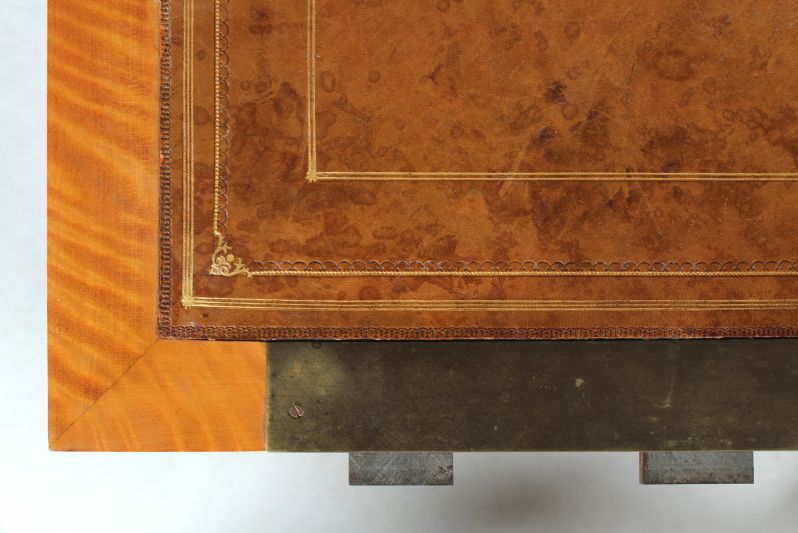 Die Schreib- und Arbeitsfläche ist mit dem originalen gepunzten Leder bespannt. Das breite Schloss verschließt das Schreibfach mit drei Riegeln.