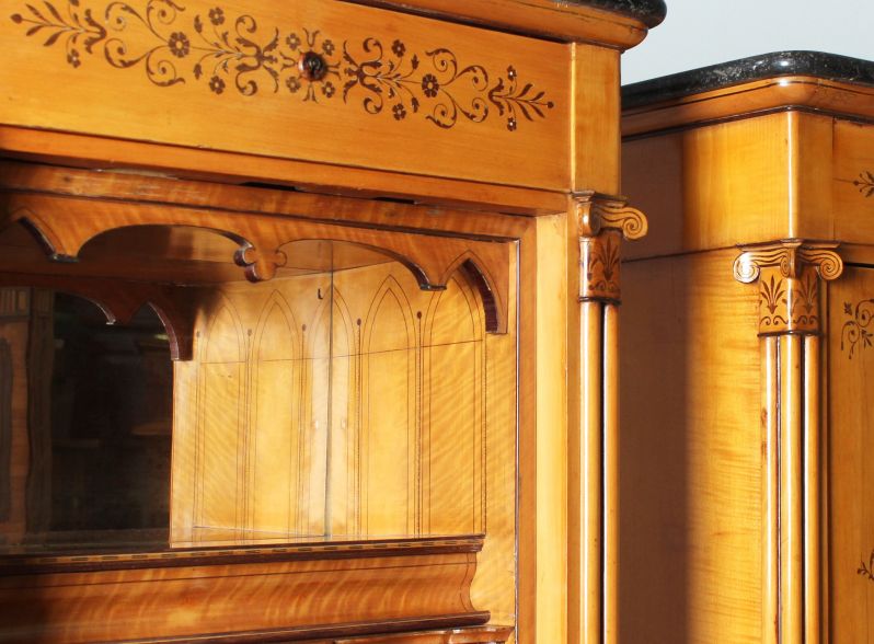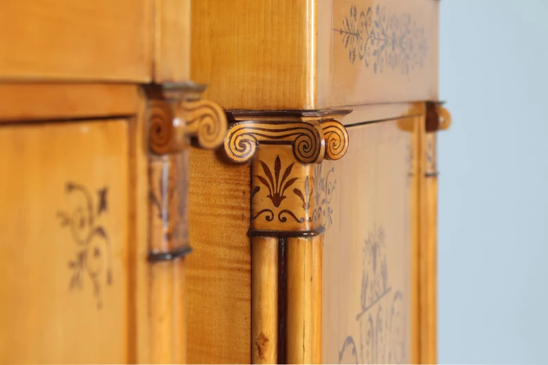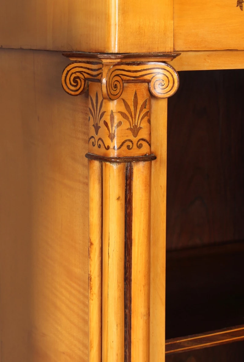 Ein wirkliches Highlight sind die flankierenden Bündelsäulen mit ihren absolut außergewöhnlichen, fein intarsierten, ionischen Kapitellen. Um die Mehrgliedrigkeit der Säulen zu betonen wurde je ein schmaler Streifen dunklen Holzes als Kontrast zwischen die einzelnen Stränge gelegt.