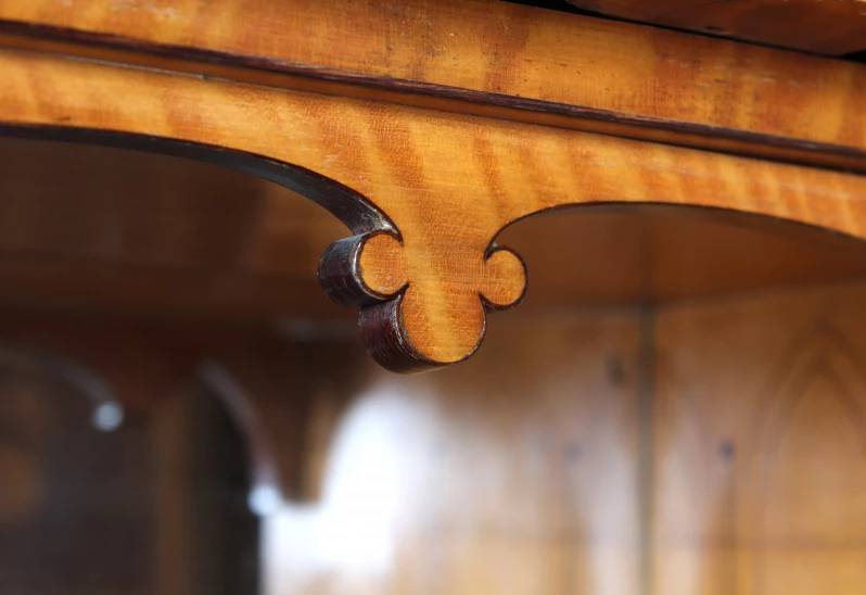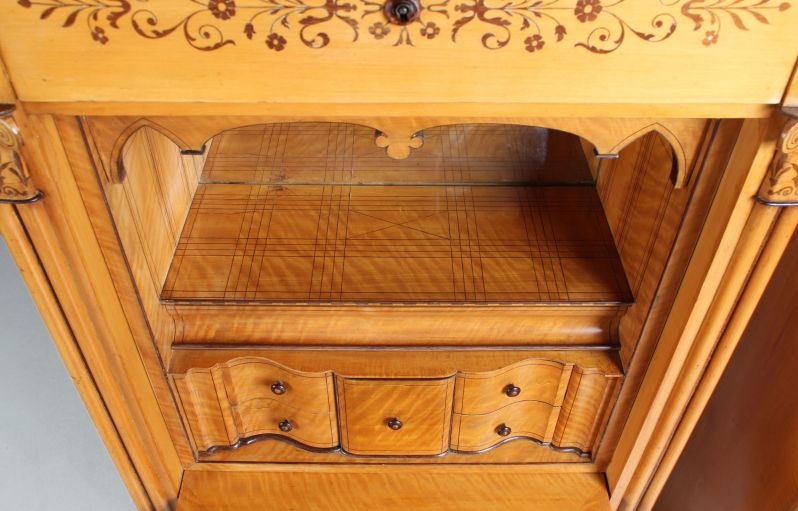 Den oberen Abschluss des Schreibfaches bildet eine mit Dreipass und Spitzbögen ausgeschnittene Zierleiste aus Mahagoni, die in Ahorn furniert ist und durch feine Einlagen akzentuiert wird. Wenn Sie sich das Foto anschauen, auf dem der Spitzbogengang mit dem rückseitigen Spiegel zu sehen ist, dann werden Sie sehen, dass die zuvor genannte Zierleiste rückseitig genau so aufwendig gestaltet ist wie vorne und somit auch im Spiegel attraktiv ist. Das ist Liebe zum Detail in höchster Vollendung.