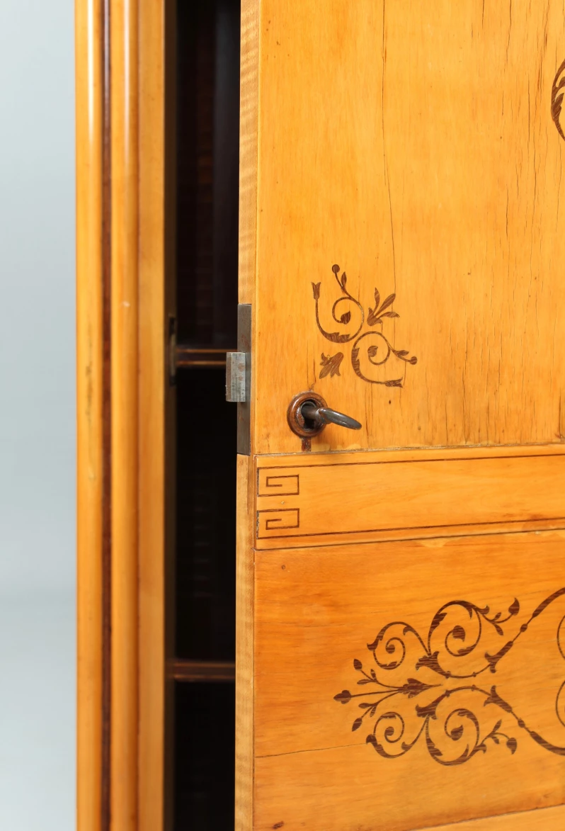 Um die hellen und schlichten Oberflächen zu beleben, wurden Motive aus dunklen Hölzern wie Amaranth, Mahagoni und Palisander eingelegt.