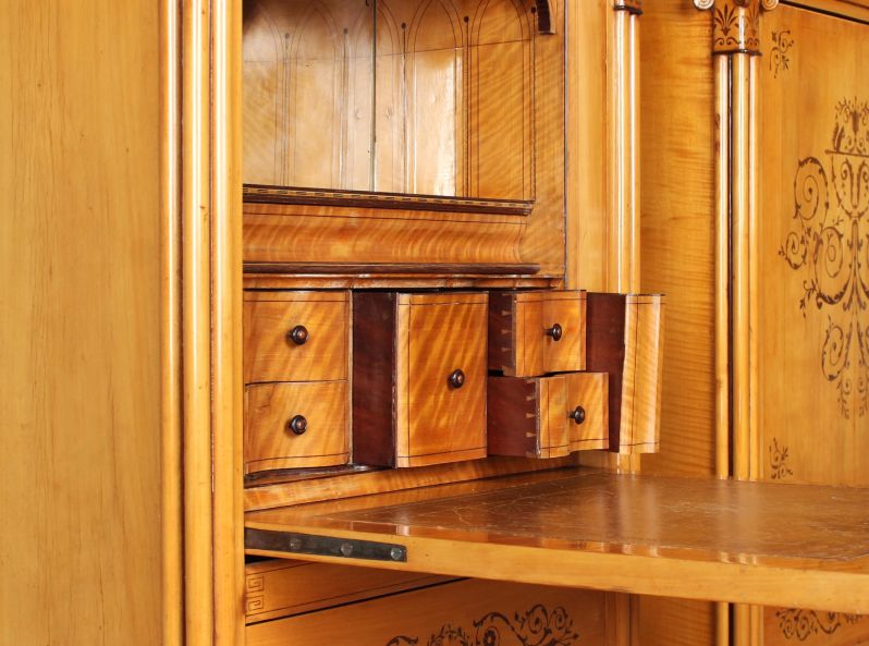Über einer Reihe elegant geschwungener Schublädchen und durch ein aufwendiges Filetband abgegrenzt, befindet sich ein großes offenes Fach. Der Boden des Faches ist mit geradlinigen, geometrischen Marketerien versehen. Seitlich erheben sich hohe Spitzbögen, die sich durch den rückseitig montierten Spiegel zu einem regelrechten Bogengang verlängern.
