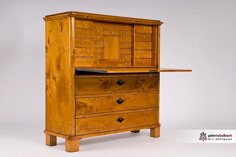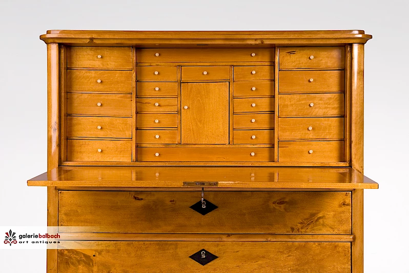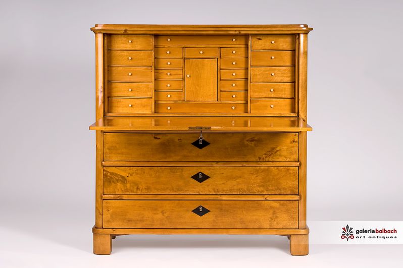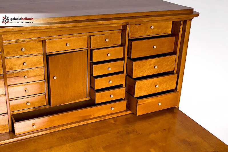 24 teilige Inneneinrichtung. Außen je fünf übereinanderliegende Schübe. Zentral eine Tür flankiert rechts und links von je fünf-, oben zwei und unten eine Schublade.