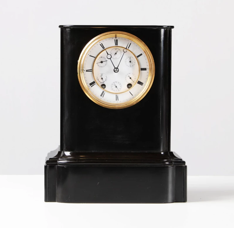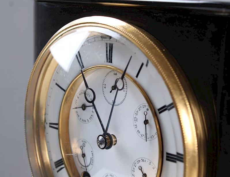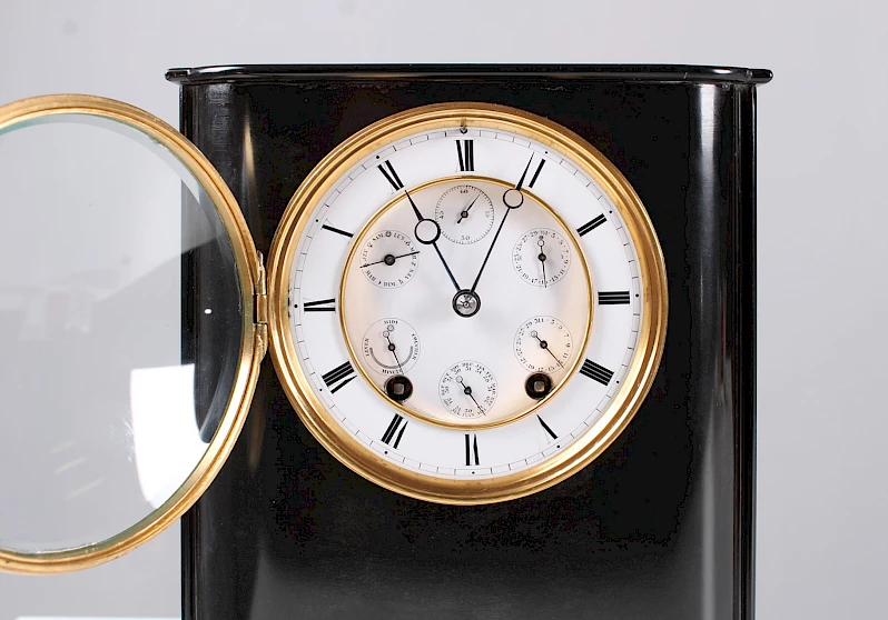 Aus dem schlicht schwarzen Gehäuse aus poliertem Marmor sticht das elegante, mit sechs Komplikationen versehene Zifferblatt, hervor.