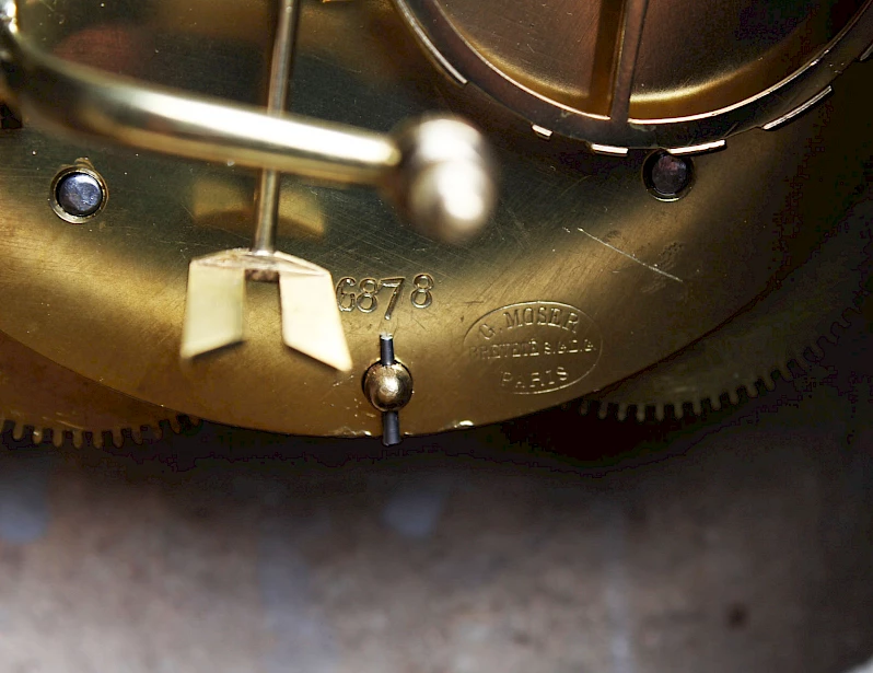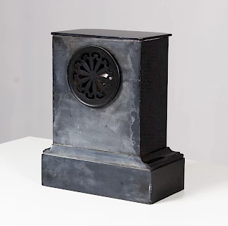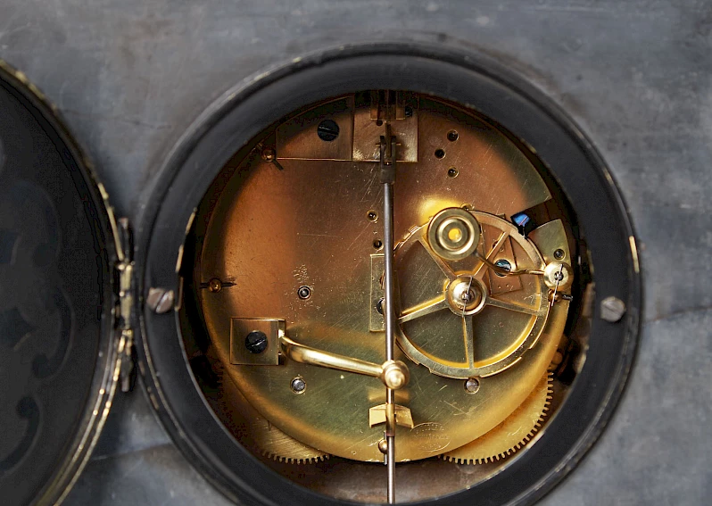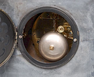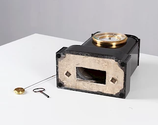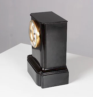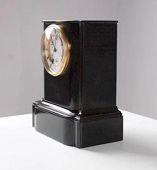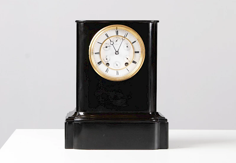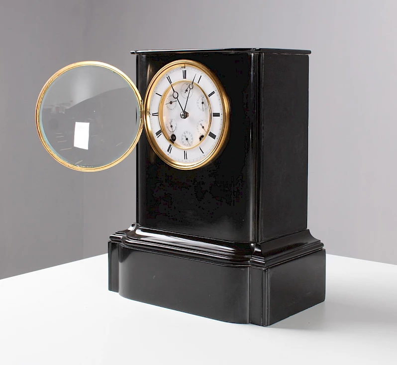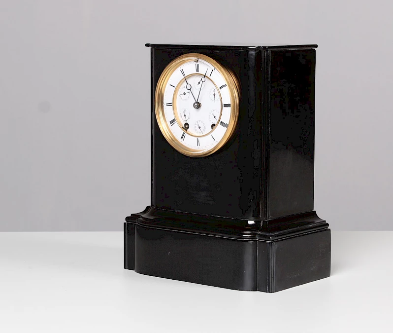 Äußerst seltene Historismus-Pendule im zeittypischen schwarzen Marmorgehäuse. Geschwungen ausgearbeitetes Sockelgeschoss, leicht überstehende Deckplatte.