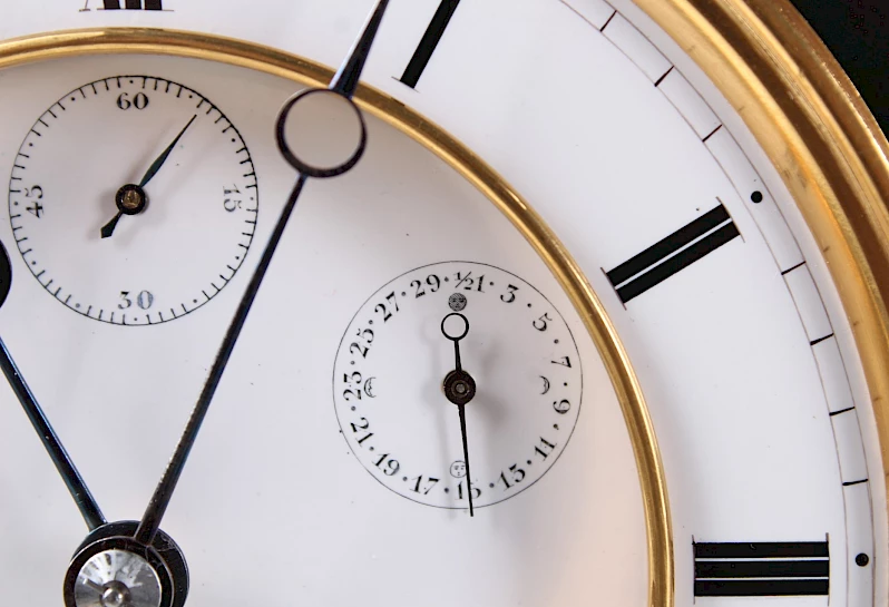 Ebenfalls zeittypisch ist das zweigeteilte Hauptzifferblatt, das auf der äußeren Skala die römischen Stundenziffern zeigt.