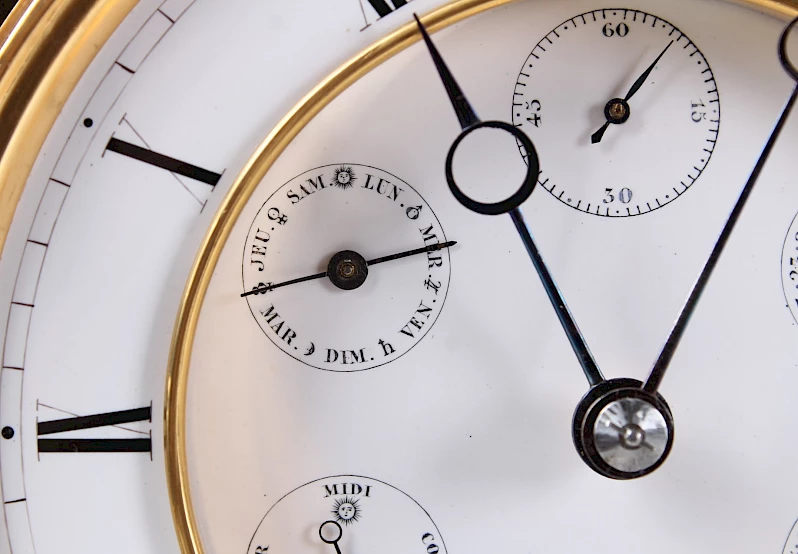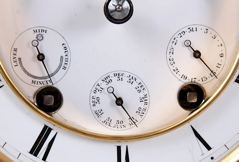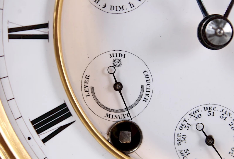 Bei der XII sehen wir die kleine Sekunde, bei der II das Mondalter, bei der IIII wird der Tag des Monats angezeigt, bei der VI der Monat. Bei der VIII wird der Stand der Sonne gezeigt von Lever (aufgehen) über Midi (Mittag) zu Coucher (untergehen) und Minuit (Mitternacht). Bei der X sehen wir den Wochentag mit dem gegenüberliegenden zugehörigen Symbol.