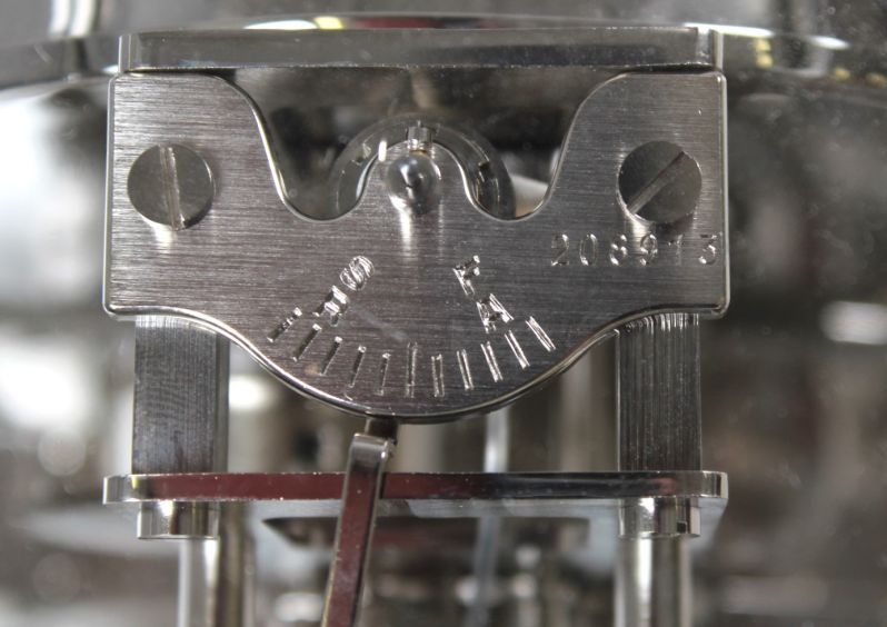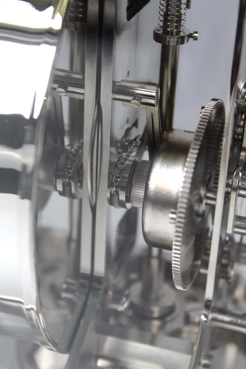 Durch das gläserne Gehäuse lässt sich das immerwährende Schauspiel des sich drehenden Torsionspendels bewundern. Es führt seine Halbschwingungen in scheinbar ewiger Beständigkeit durch.