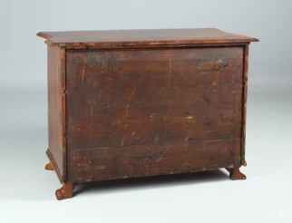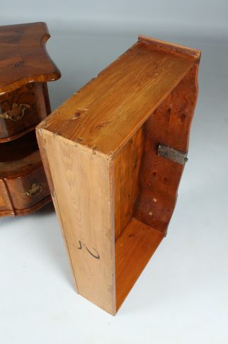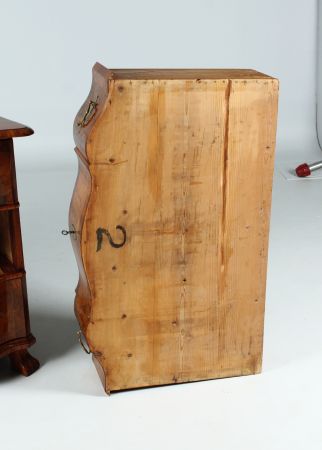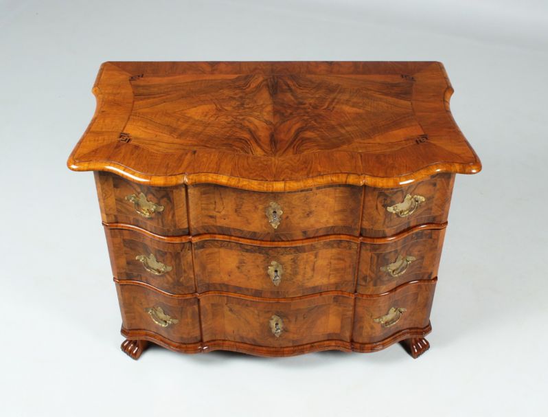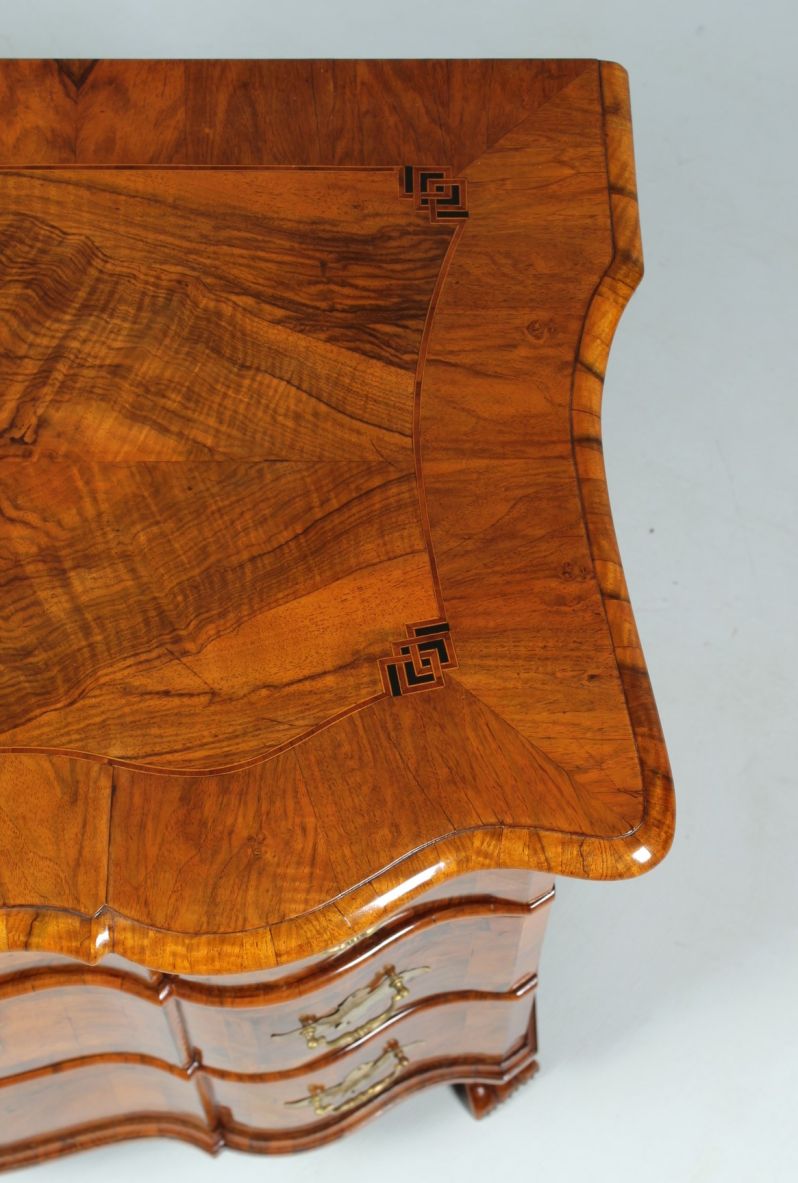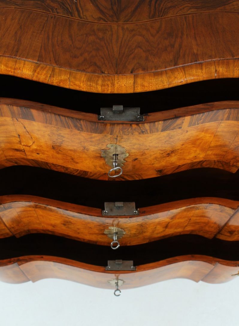 Very elegant furniture front with several curves and bends. It is impressive to see the accuracy with which the strongly curved drawers are still aligned today, approx. 270 years after they were made.