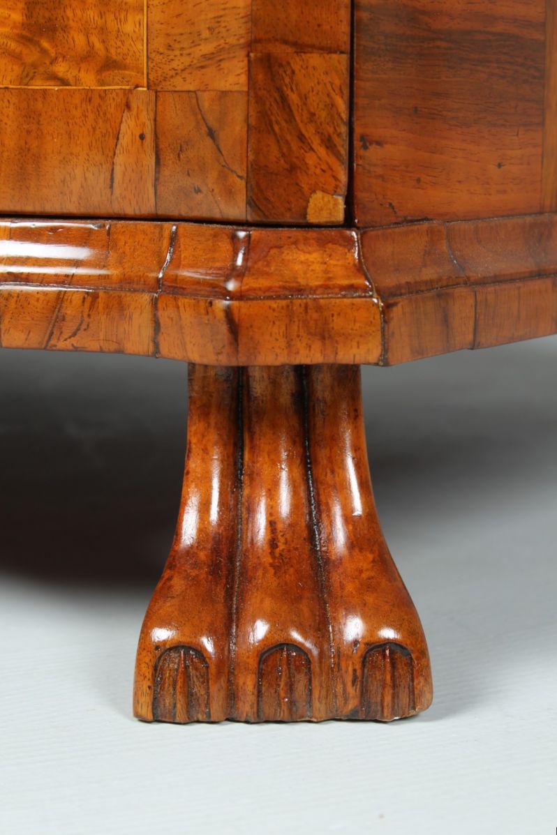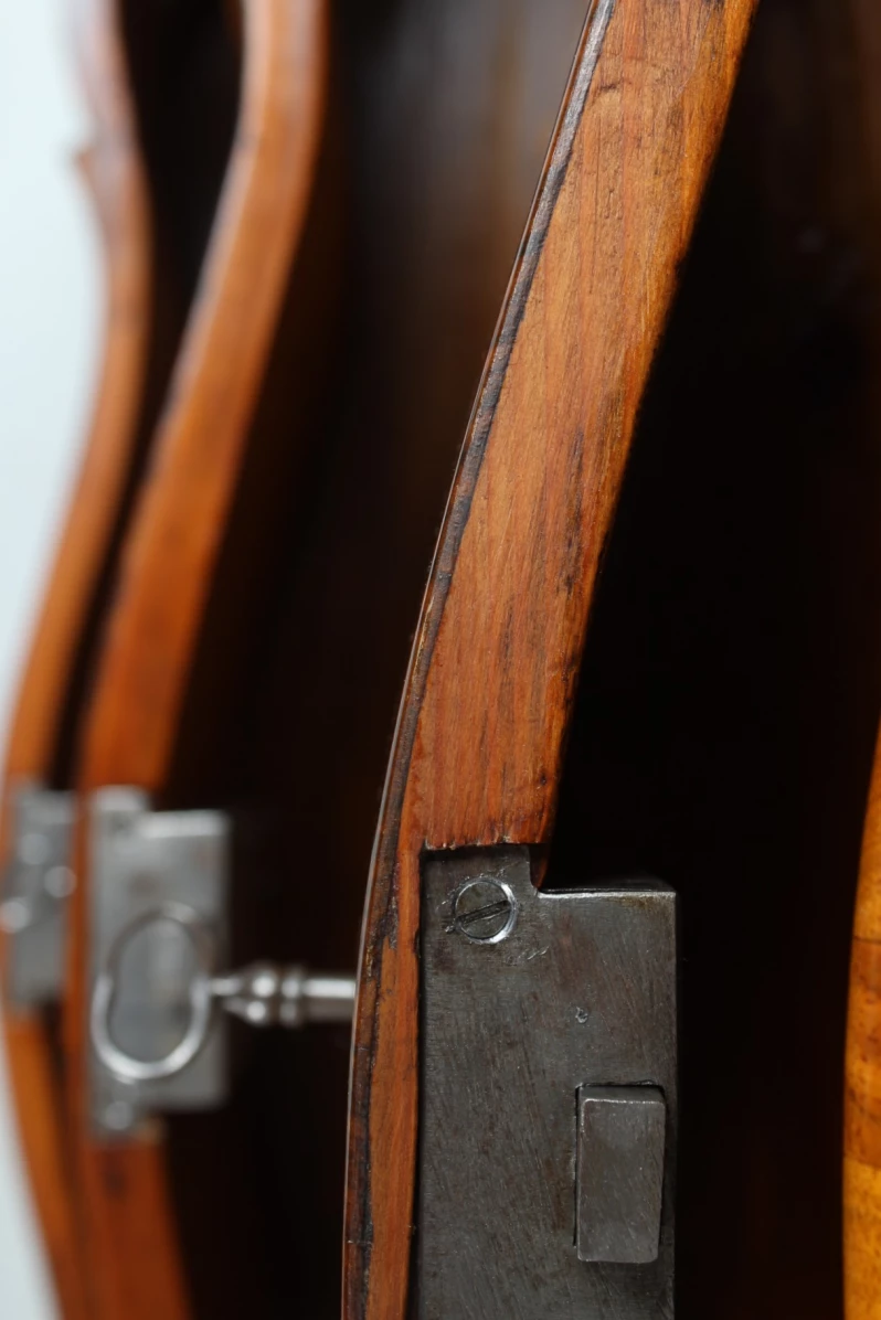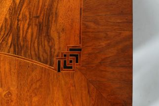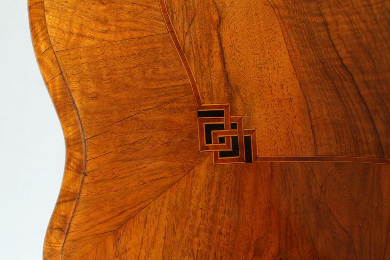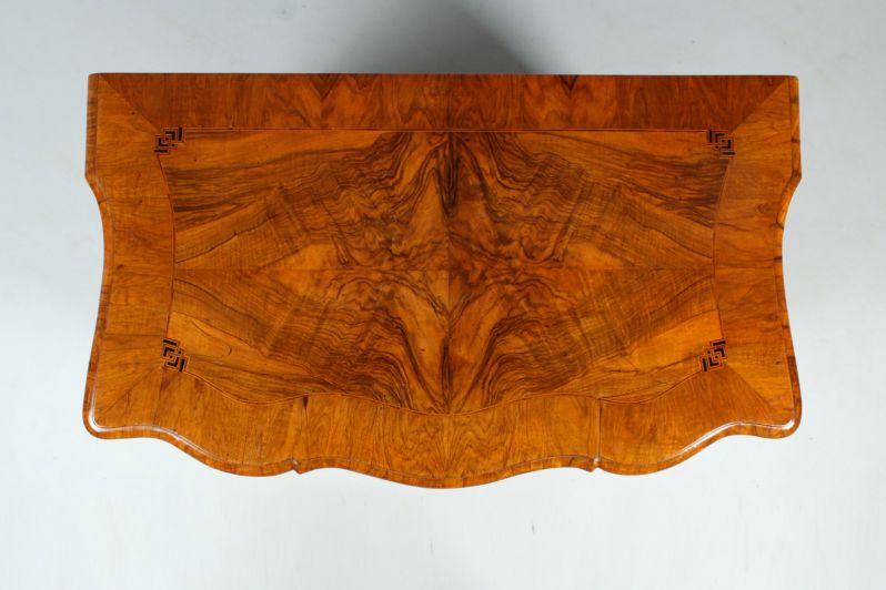 Veneered in walnut and walnut root with maple thread inlays. The original fittings blend harmoniously into the overall picture.