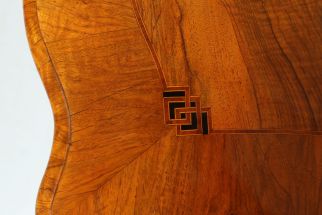 The symmetrically laid grain pattern on the top is artfully framed by geometrically and angularly twisted marquetry of maple, plum and bog oak.