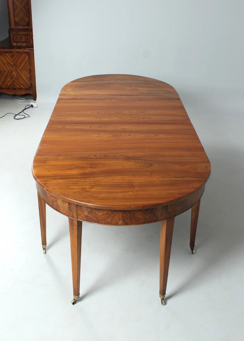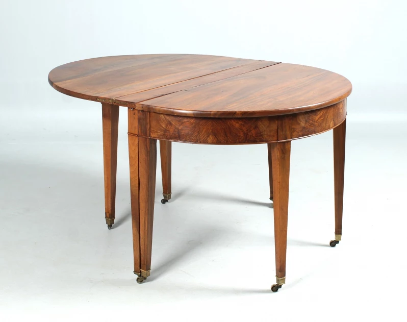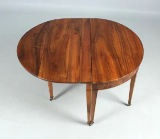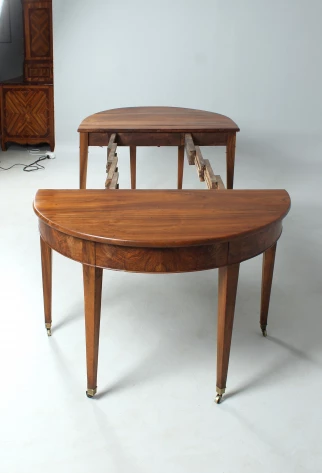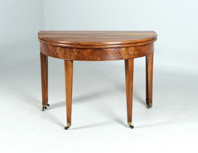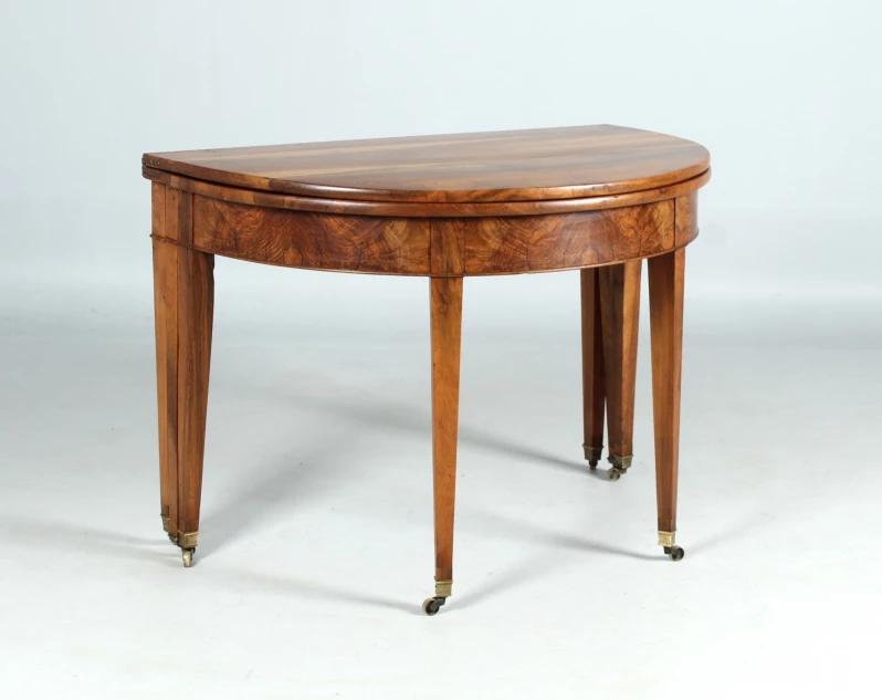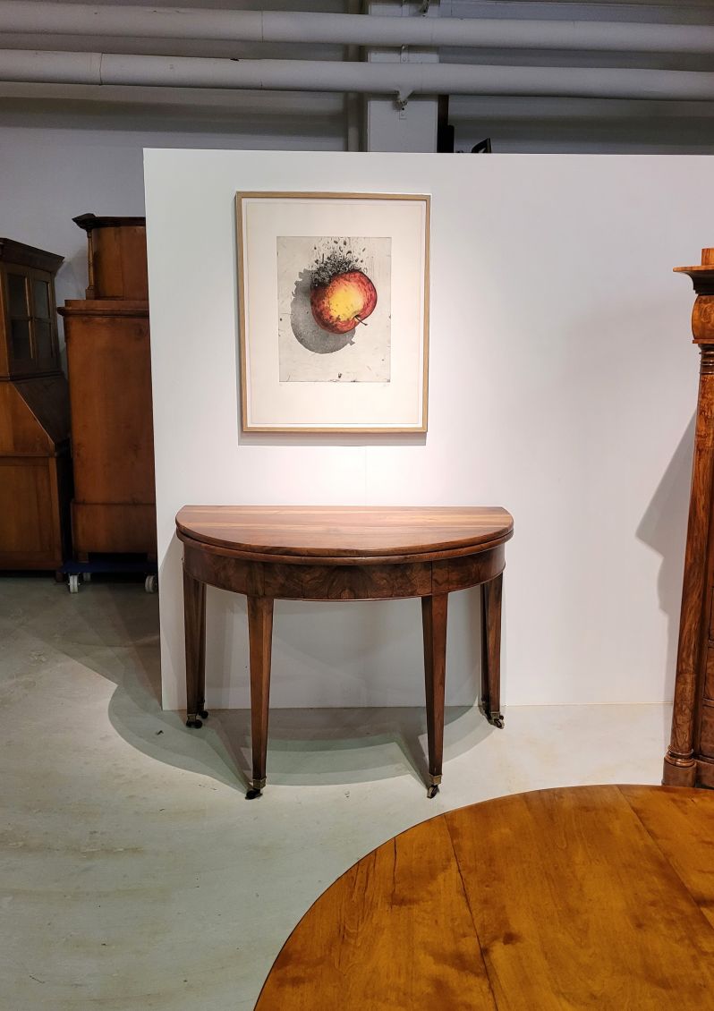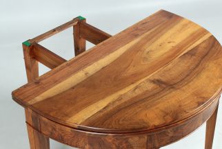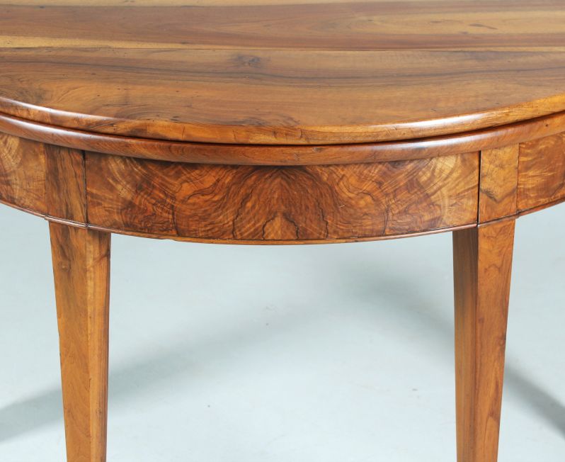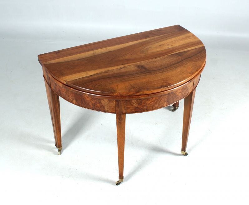 Antique, hinged console table made of solid walnut. The semi-circular shape gives the type its name "Demi Lune".