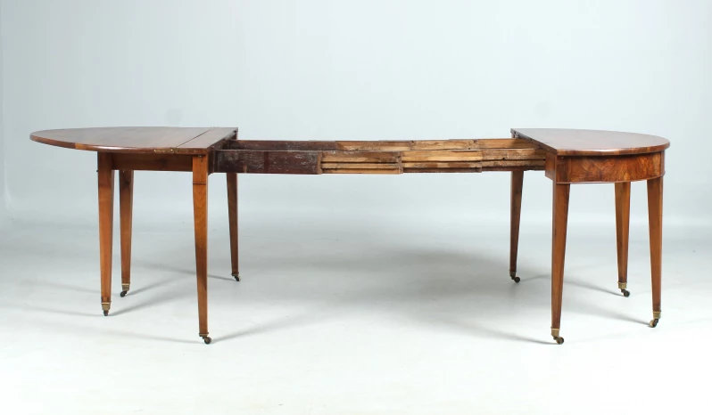When closed, we see a console that can be positioned excellently as occasional furniture on the wall at the back. The double top plate and the three rows of legs at the back catch the eye immediately.