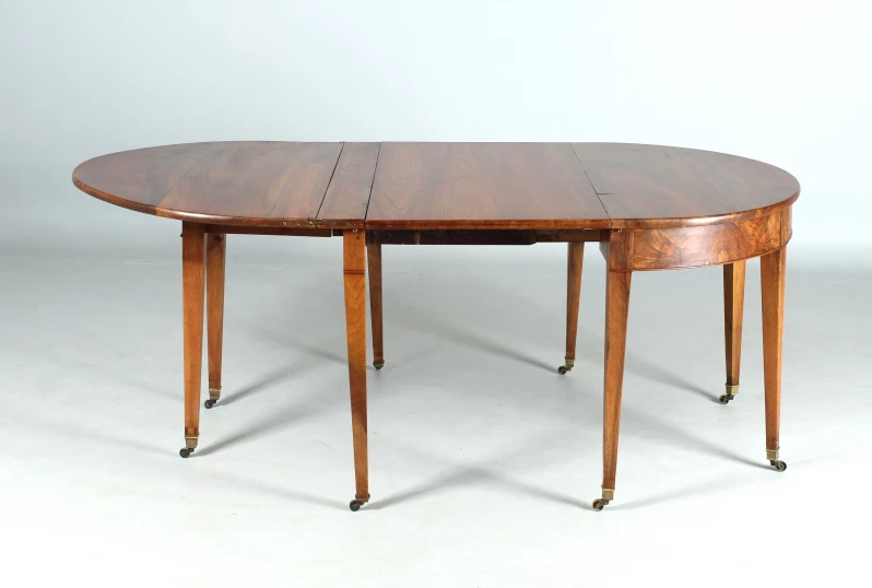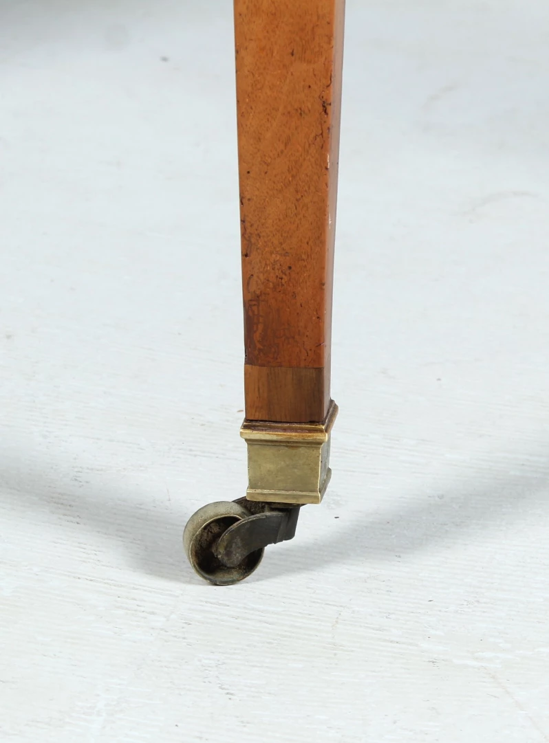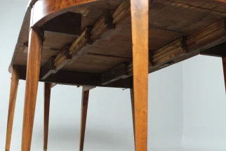 Refurbished condition with patina preserved. The pull-out mechanism works perfectly. The table is stable and suitable for everyday use. The surface is oiled and can be wiped clean with a damp cloth.