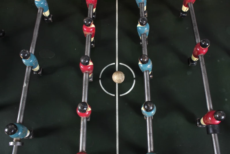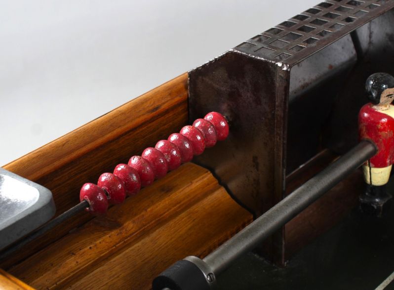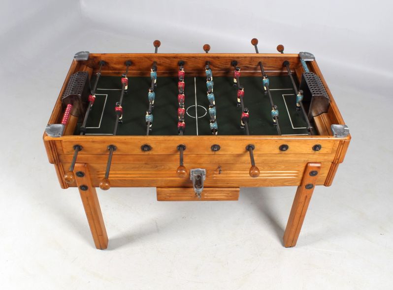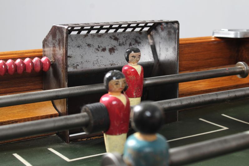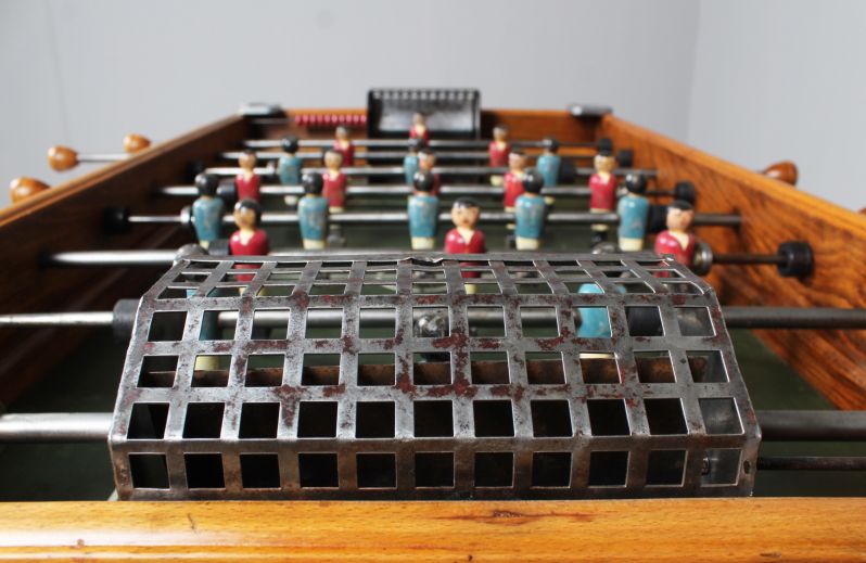 Be that as it may, we were able to uncover and retouch the original paint as far as possible, remove rust from the goals and poles, clean the playing field, stabilise the construction, remove paint from the wood and re-oil it. In short, the foosball table has been restored to its original condition and is once again absolutely playable and suitable for everyday use.