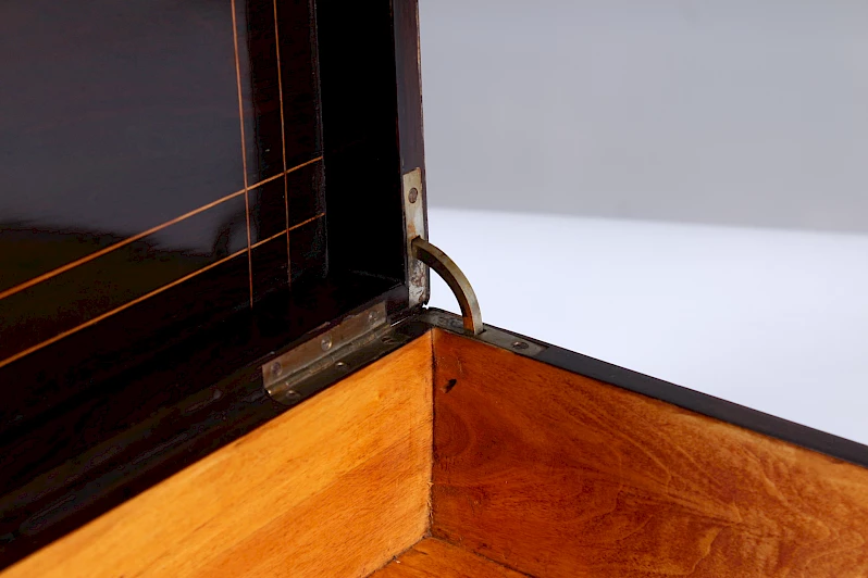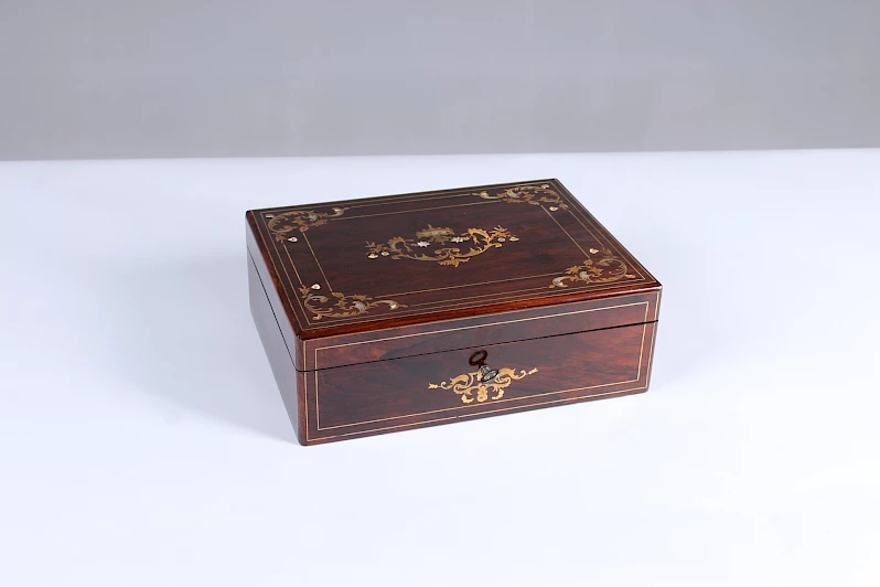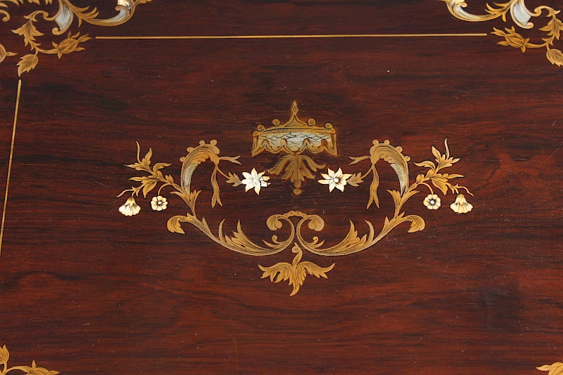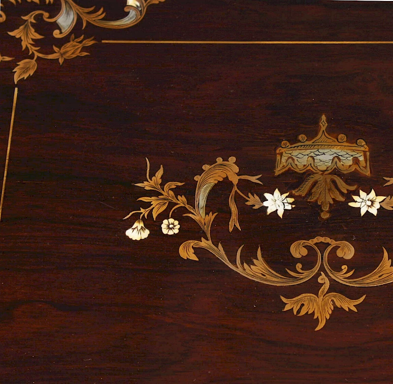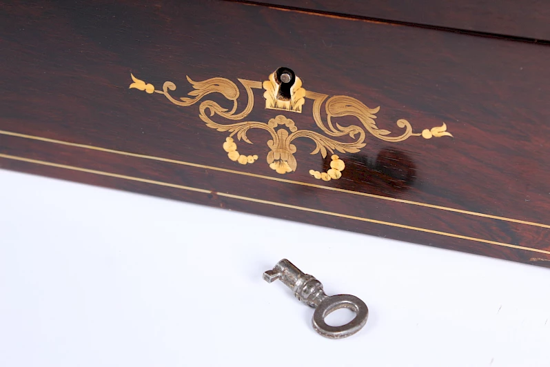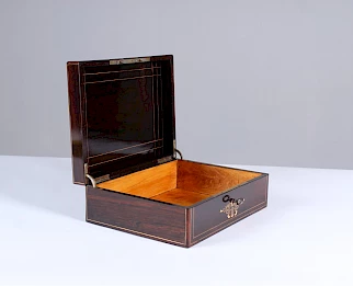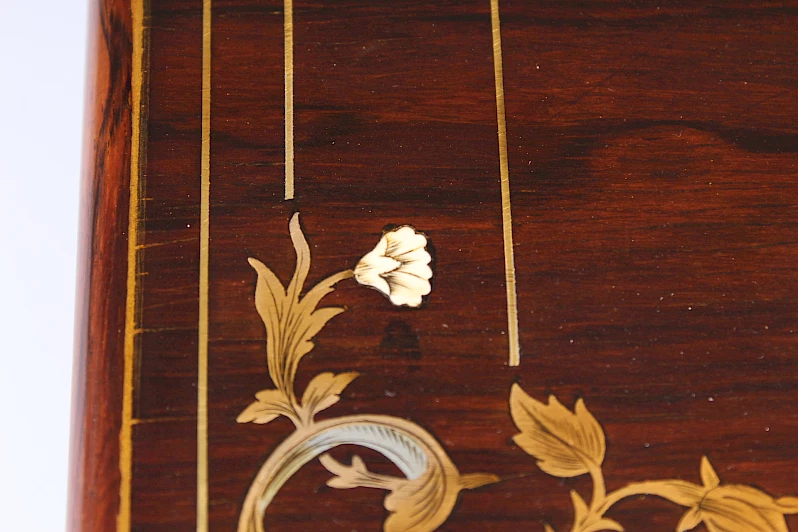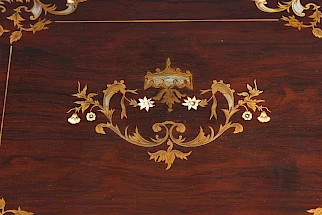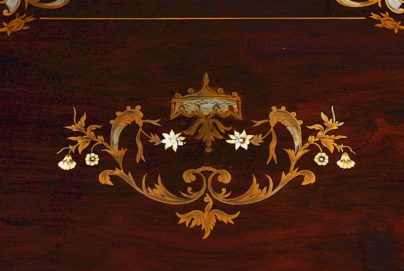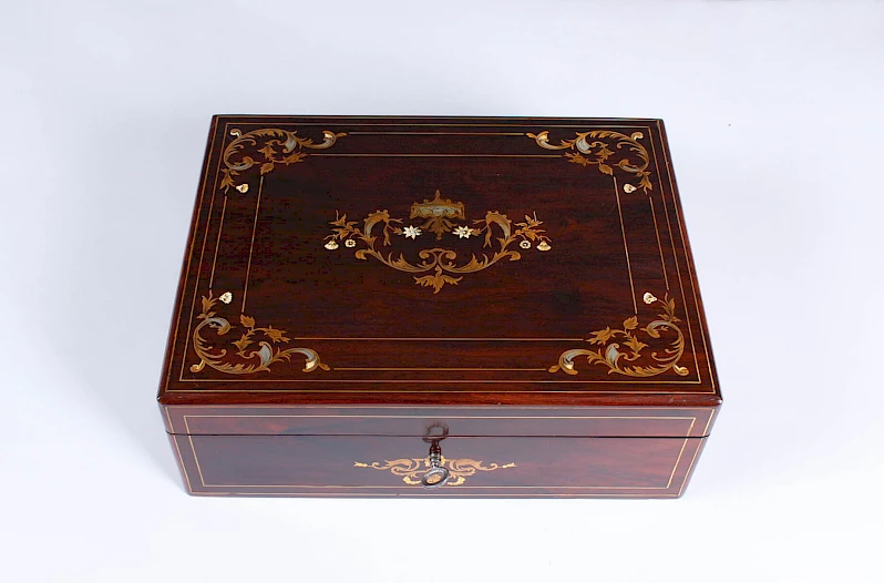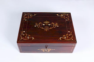 Rectangular box veneered in mahogany with elaborate marquetry of brass, mother-of-pearl and bone.