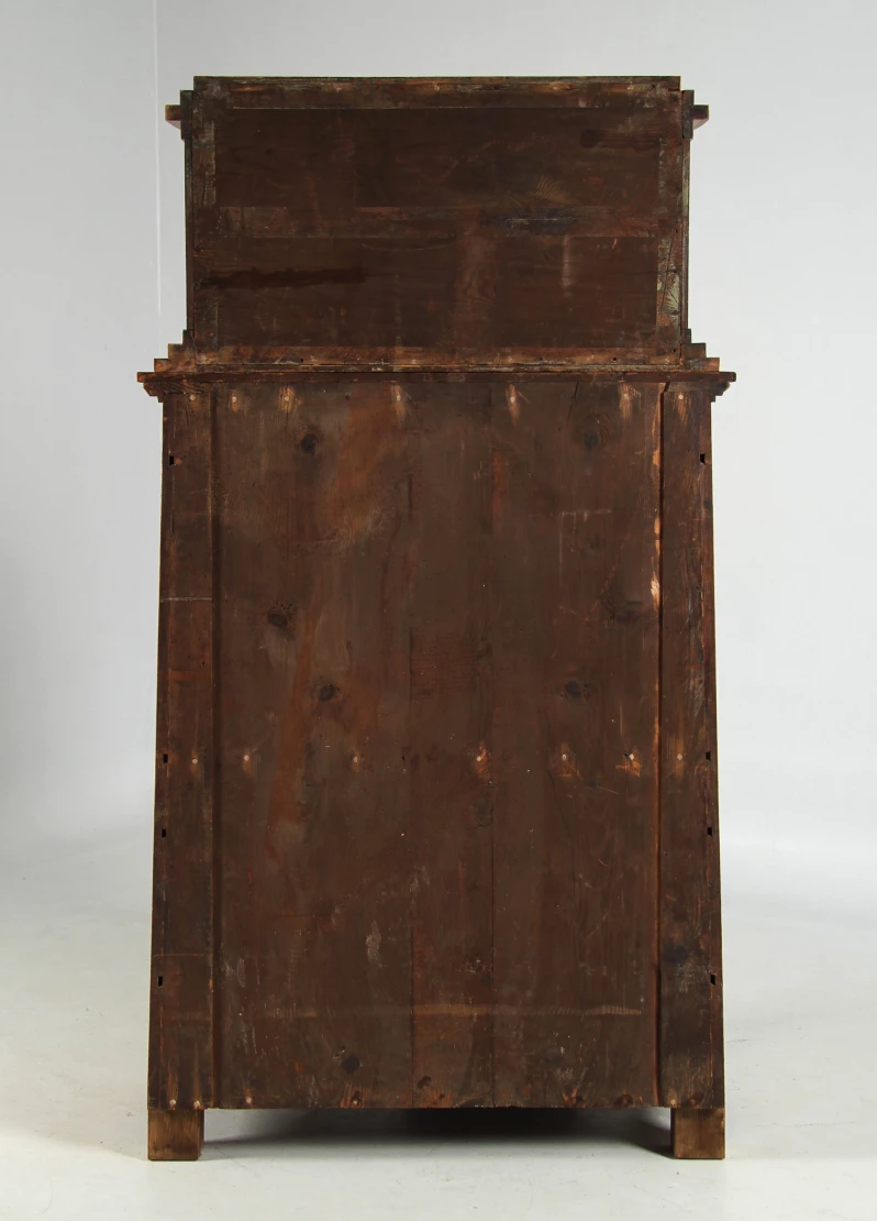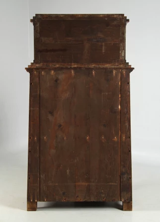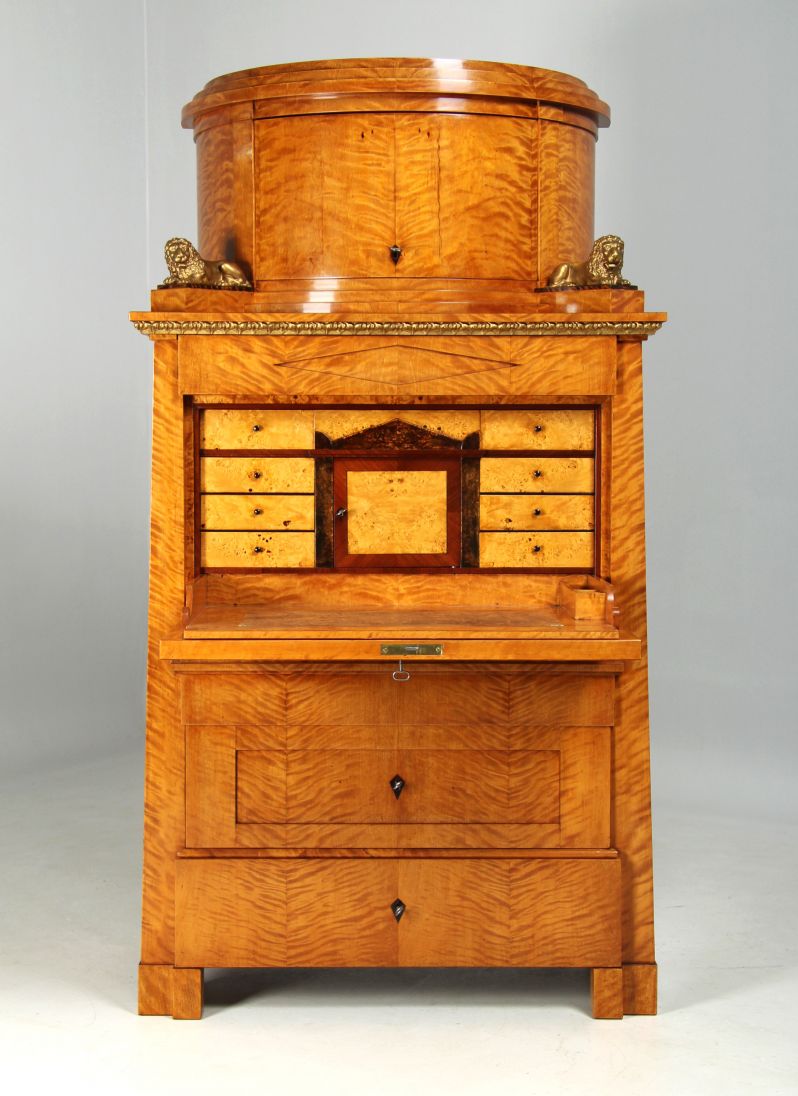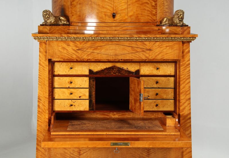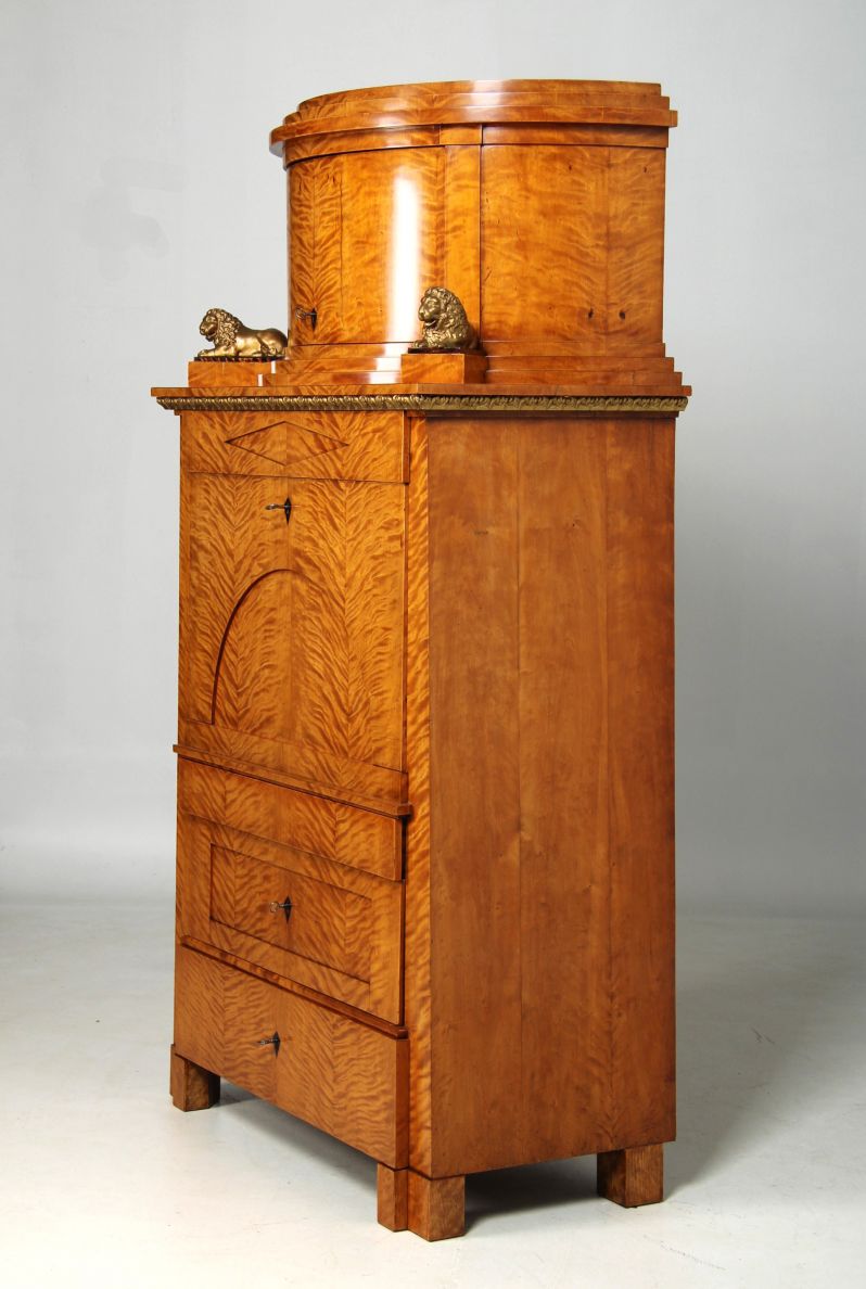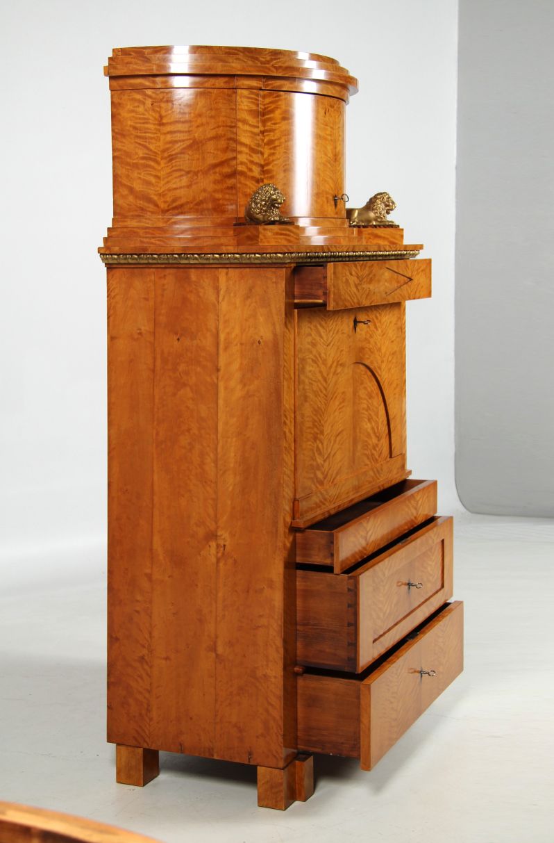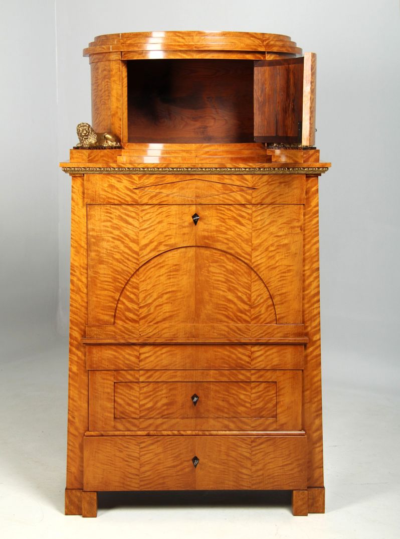 The two-part structure is divided into a substructure with four drawers and a writing flap and a crescent-shaped, single-door top hat box with two bronze lions. These are located to the left and right of a semi-circular staircase, which in turn is complemented by the stepped cornice at the very top.