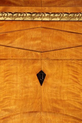 The oil gilding of the lions corresponds with the horizontal moulding, which visually divides the furniture into an upper and a lower section. The aforementioned segmentations in rectangular, semi-circular and diamond shapes break up the flatness of the front. The dark key plates on the centre axis emphasise the strict symmetry of the unit.