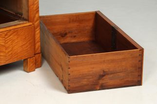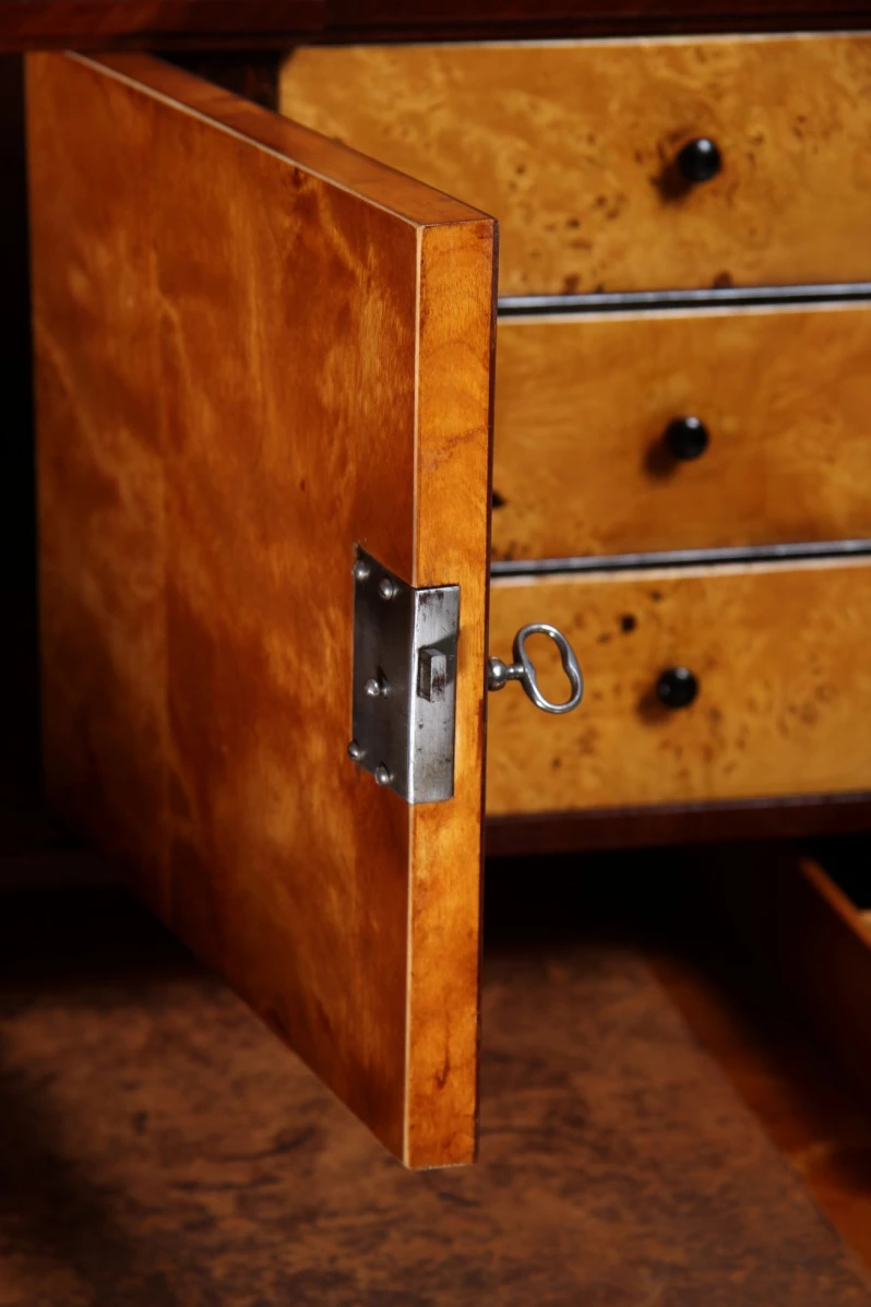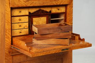 Opening the writing flap reveals a clearly structured interior veneered in light-coloured burl wood. In the lower section is a pull-out writing surface covered in leather, which protects the actual flap from signs of wear. It has a small organiser compartment that was originally used to hold inkwells, grit and nibs.