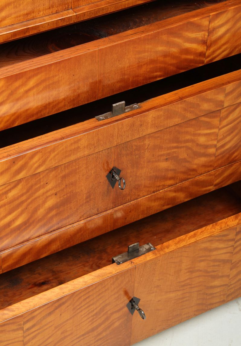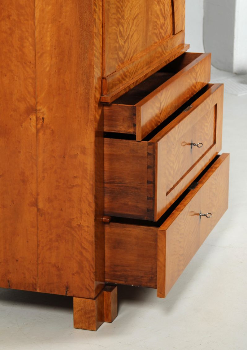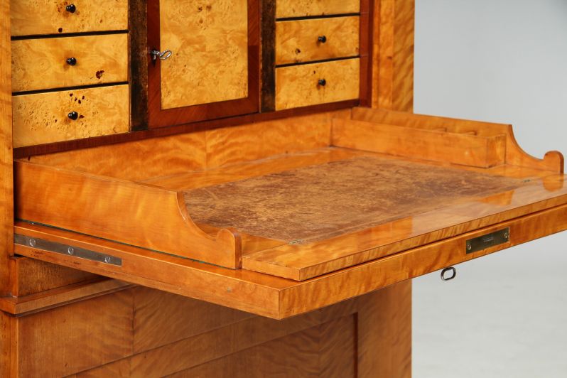 Extravagant Biedermeier secretary from the Berlin-Brandenburg area with several features characteristic of this region. These include the block feet that follow the shape of the body, the drawer fronts that protrude beyond the depth of the body, the segment-like recessed panels, the striking flamed birch veneer and the tapered body shape, which tapers from 100 cm wide at the bottom to 92 cm below the moulding.