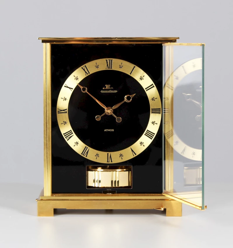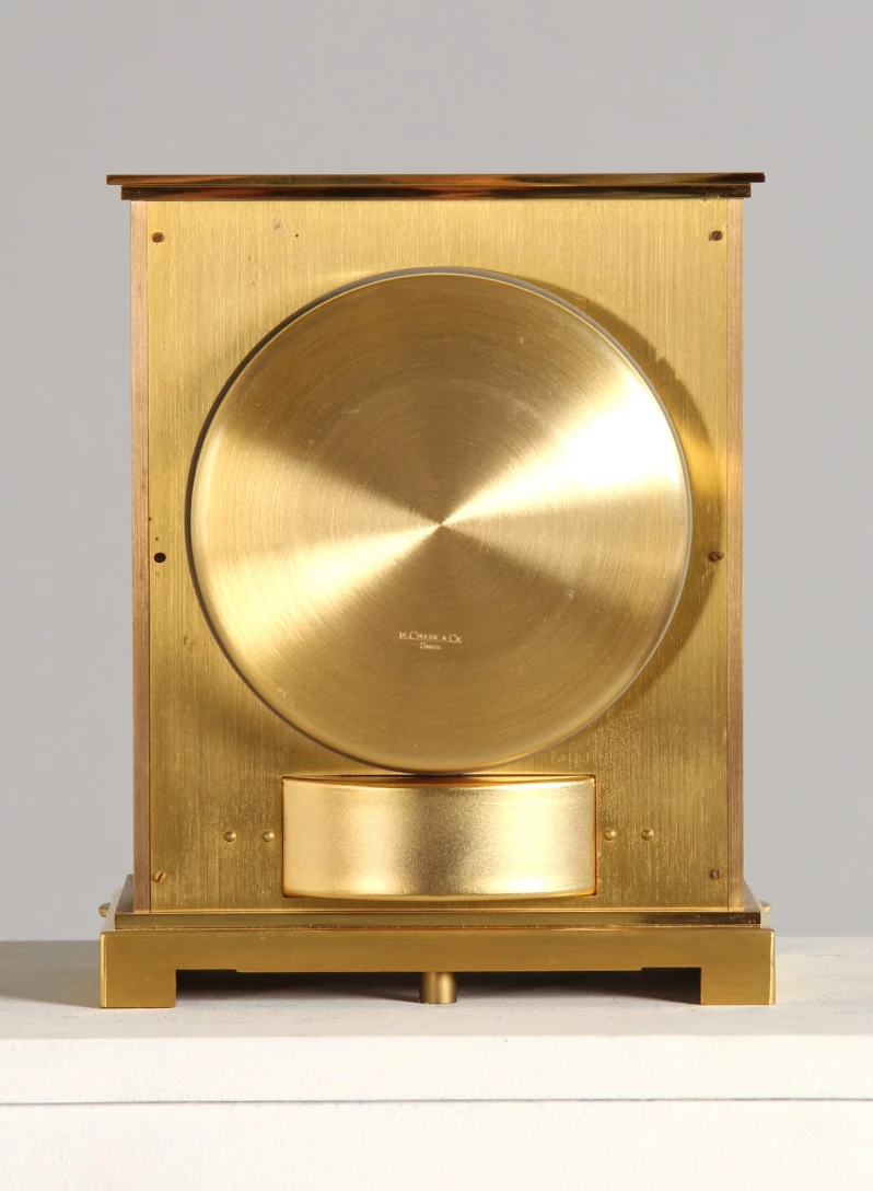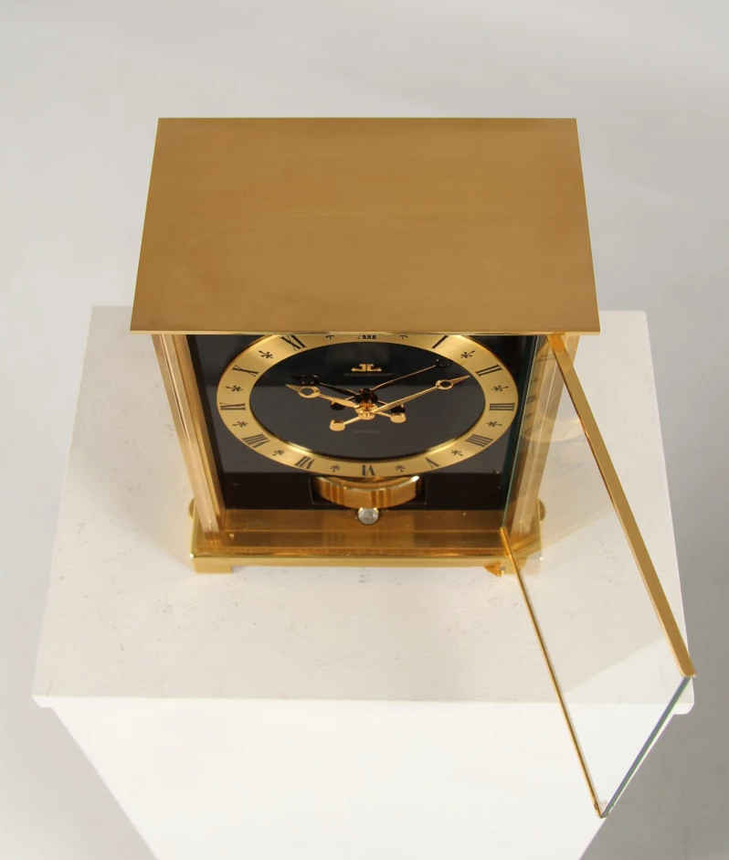 Rare Atmos VII Embassy in gilt brass case with black lacquered front and sides.