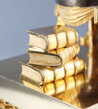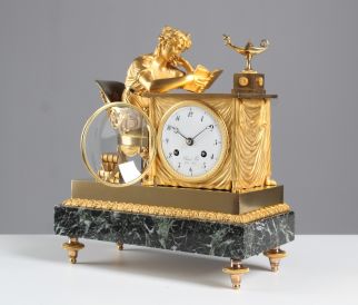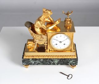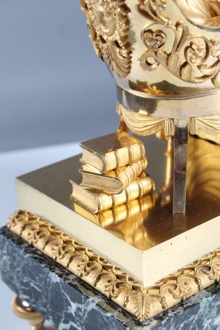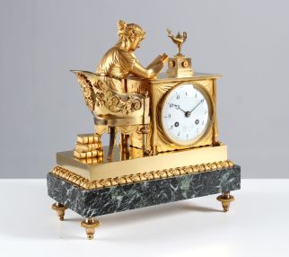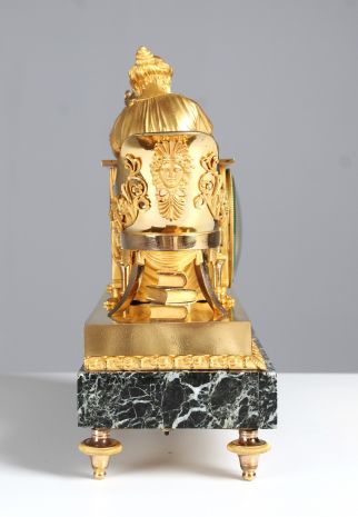 The popularity of this clock has many reasons. It has a beautiful size and a balanced composition. The interplay of the green veined marble and the fire-gilded bronze is contrasting and attractive. The clock appears noble but not too ostentatious.