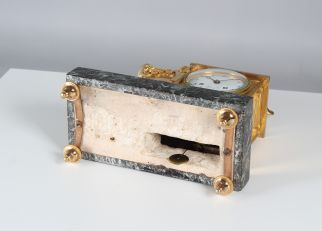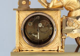 The movement is a French pendulum movement with a duration of one week. The pendulum is suspended on a thread, as was usual at the time. The speed is regulated by a knurled disc on the back of the movement. The chiming movement strikes on the half and full hour.