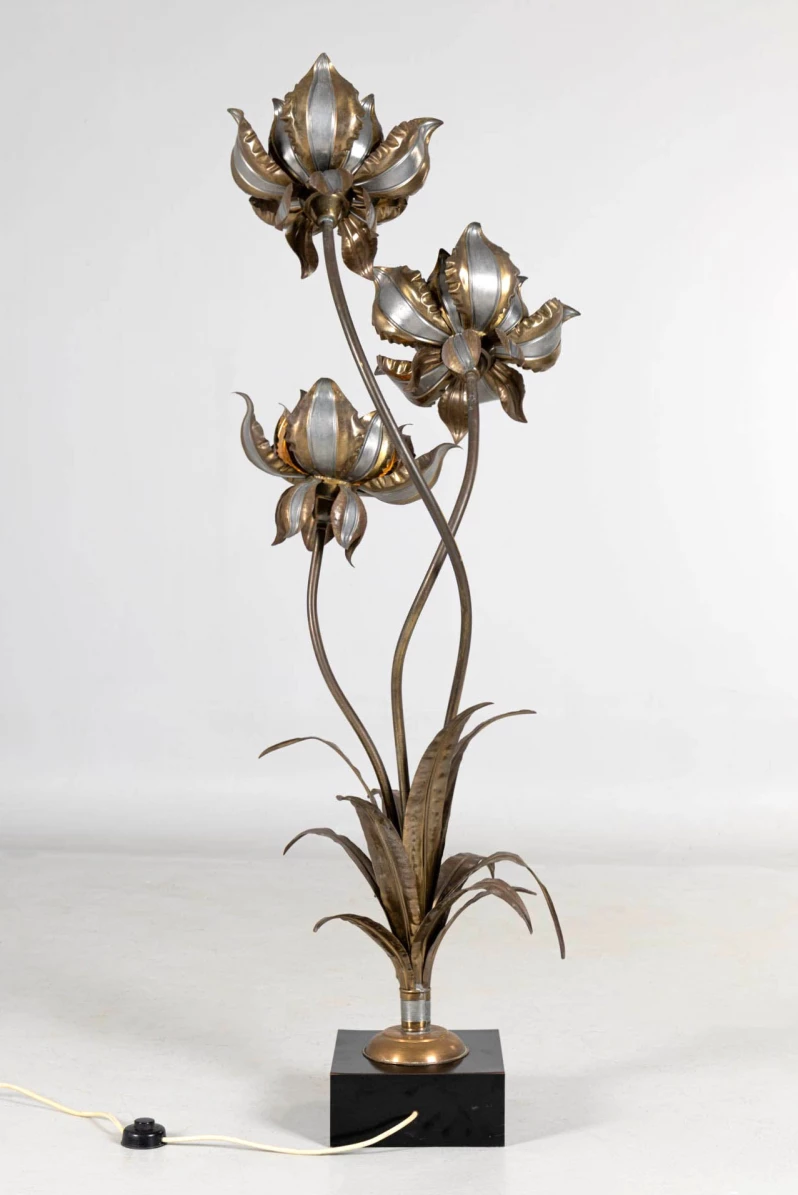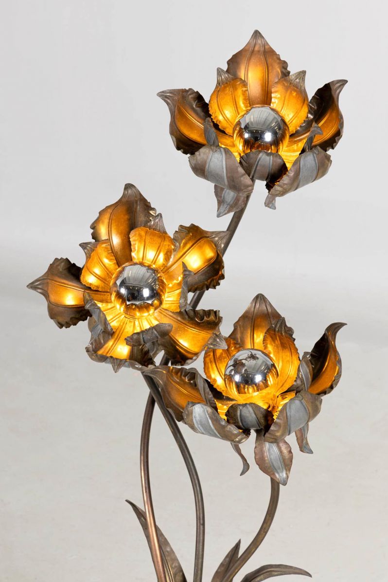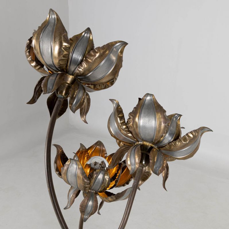 The lamp consists of three eye-catching blooming flowers with carefully crafted petals that fold outwards to reveal the silver-plated bulbs at the top as a stigma. The petals are made of brass and silver-plated brass, creating a sophisticated two-tone effect. The interplay between the matt surface of the petals and the shimmering, reflective stigmas enhances the visual appeal of the lamp. When switched on, the piece comes to life - the light radiates from the spheres and emphasises the sculptural details of the petals.