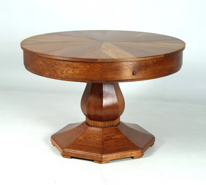 The table stands on an octagonal base that supports a column built on a fluted frieze. The wood used is oak, partly solid and partly veneered.