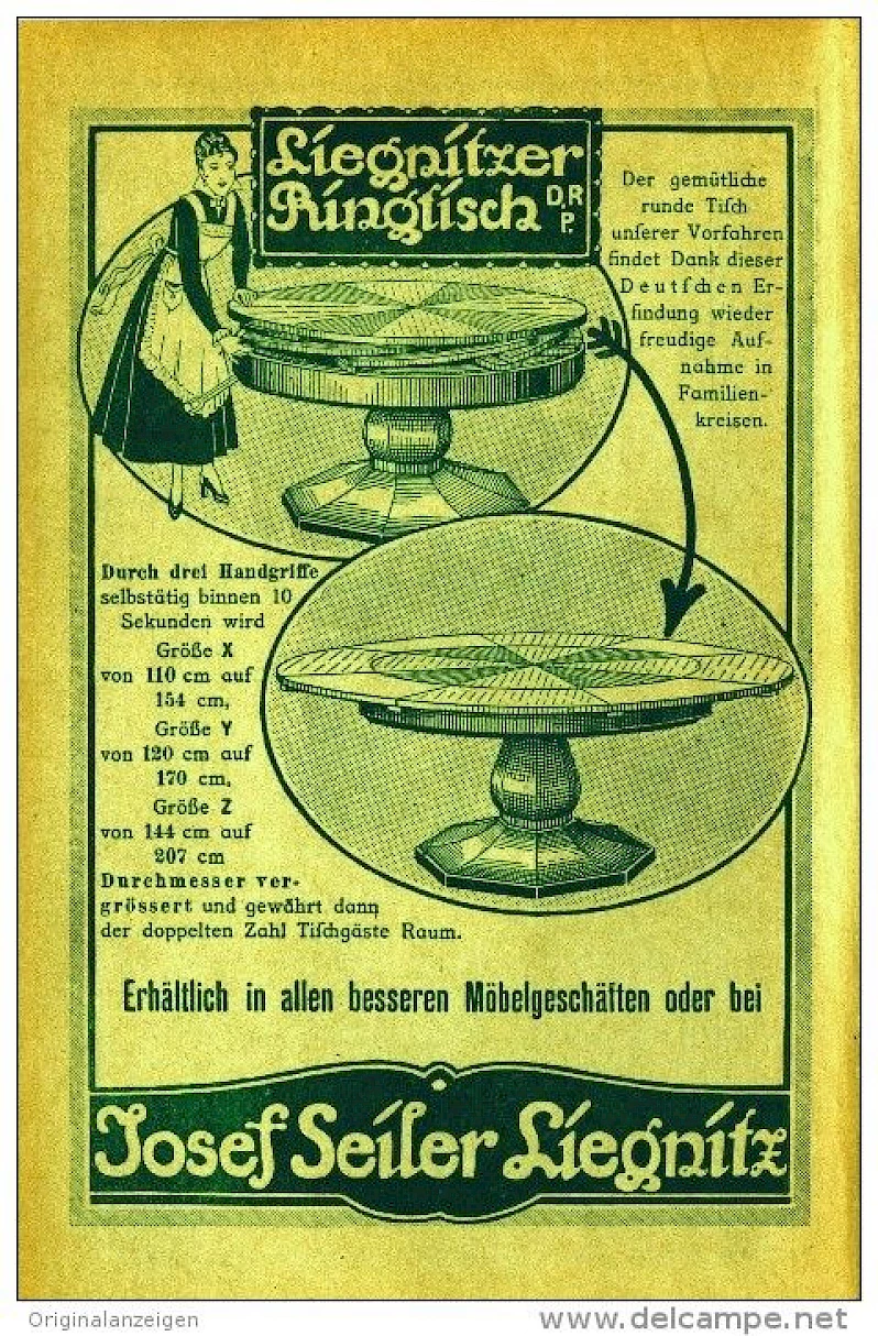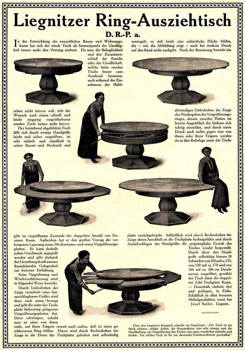 Josef Seiler ran a furniture workshop in Liegnitz, now in Poland, which at the time belonged to Silesia. He developed and patented the mechanism of the table shown here in the 1920s and had it registered as a German Imperial Patent D.R.P.. The piece of furniture was produced in various sizes in small series.