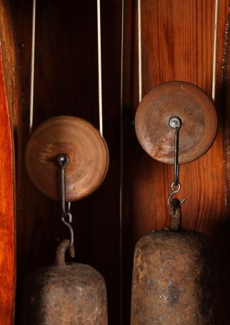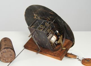 Based on this, we see the lyre-shaped centre section with a viewing window door. Behind the glazing, which consists of two panes set against each other, the perpetual spectacle of the moving pendulum and the weights lowering over the course of a week can be observed.