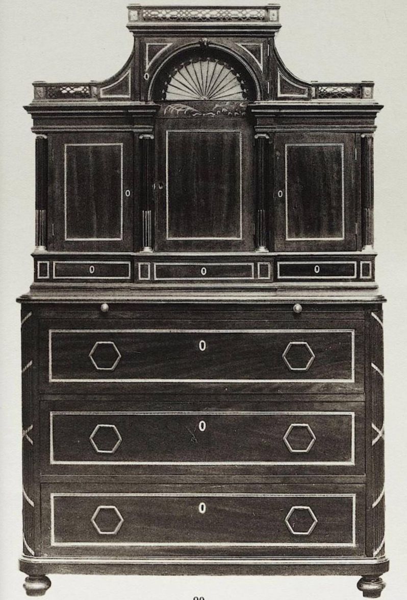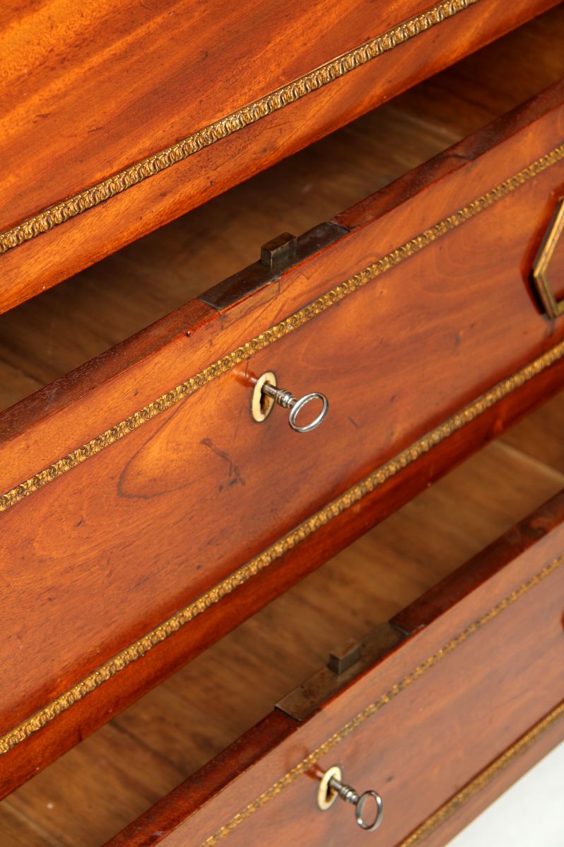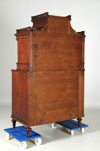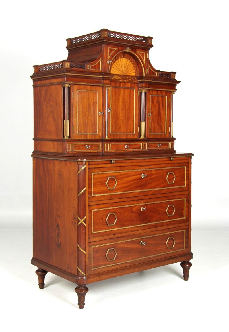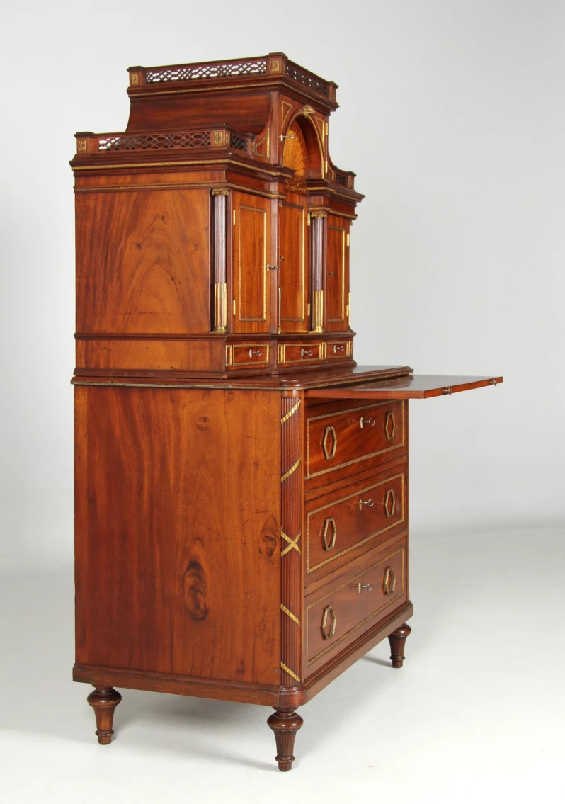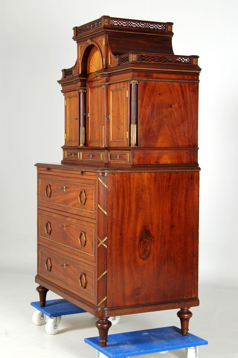 A chest of drawers with turned legs, three large drawers and a pull-out shelf under the top supports the recessed top of the two-part collection piece. Quartered lictor bundles wrapped in gilded bronze bands form the front corner posts of the chest of drawers.